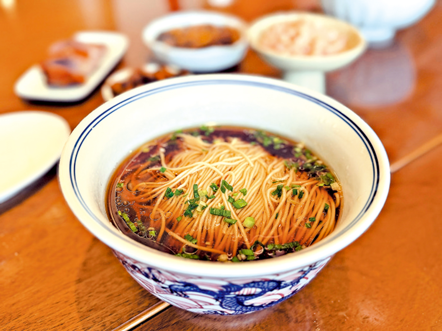 點一碗紅湯麵。師傅熟練地撈起麵條,瀝水、下碗,舀上一勺滾燙的紅湯,澆上葱花與豬油,熱氣立刻把眼鏡熏花。那湯色不張揚,卻紅得溫柔,似晚霞映在水面。第一口下去,鹹中帶甜,甜中帶香,湯順着喉嚨一路滑到胃裏,寒意也就被驅散了。