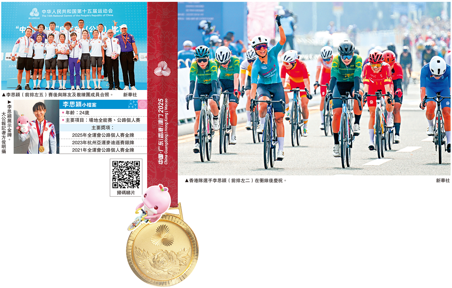 第15屆全運會9日開幕,全日賽事誕生唯一一枚金牌,這份榮耀落在香港單車選手李思穎身上,這名24歲單車手昨日勇奪在珠海開賽的女子公路單車個人賽。這是李思穎繼2021年全運會奪得港隊全運會女子公路個人賽歷史首金後成功衛冕,穩穩扛起香港單車隊領軍大旗。賽後,李思穎難掩喜悅,形容勝出全賴「相信隊友」,因為團體合作盡全力支援,讓她發揮最佳水準。\大公報記者 方俊明珠海報道