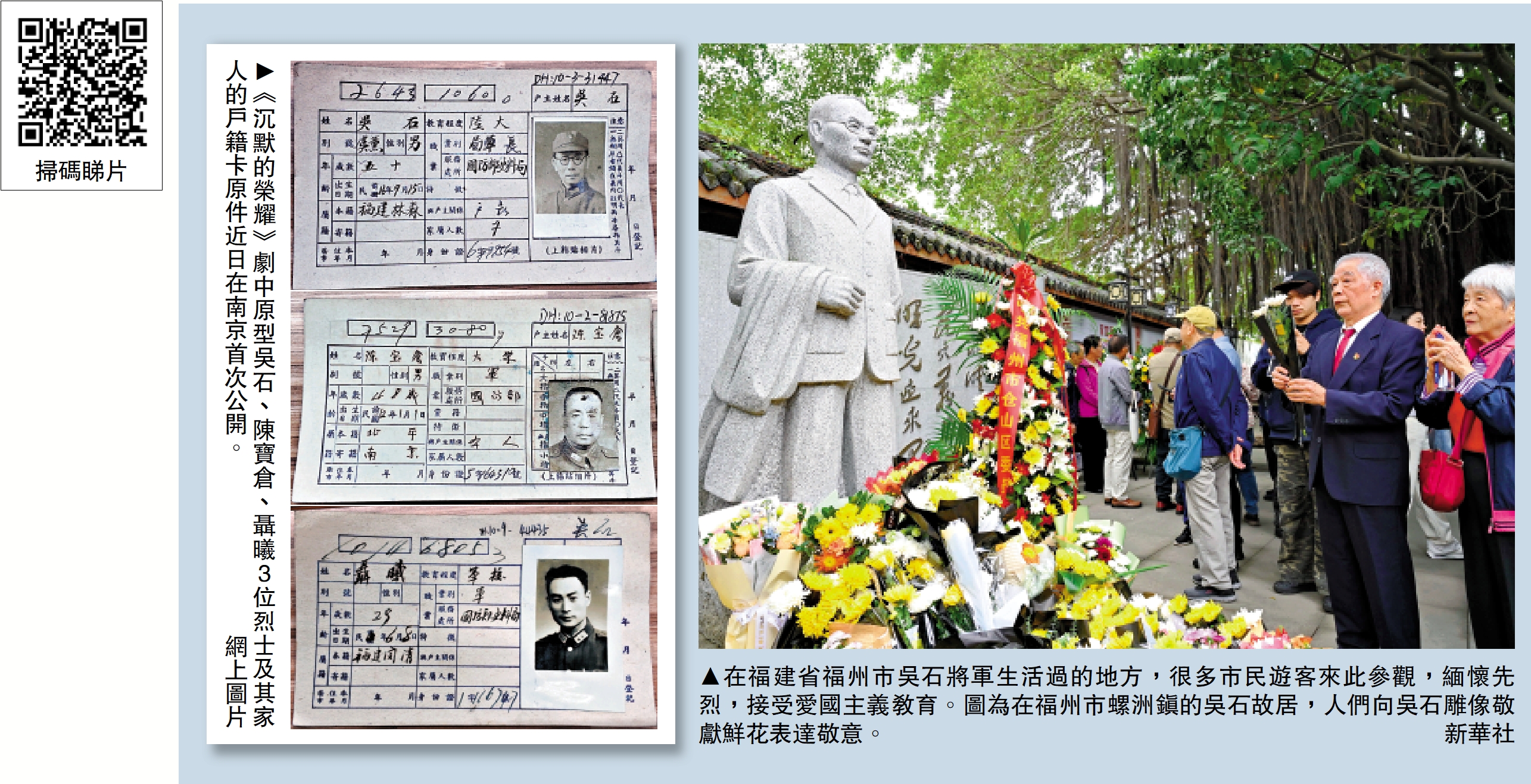 反映台灣隱蔽戰線鬥爭的電視劇《沉默的榮耀》在兩岸均引發收視熱潮,劇中原型吳石、陳寶倉、聶曦3位烈士及其家人的戶籍卡原件近日在南京首次公開。這些形成於1946至1948年間的珍貴史料,與國家安全部此前解密的檔案形成互證,進一步呈現了英烈們從南京潛伏到台灣就義的悲壯歷程。\大公報記者 賀鵬飛南京報道
