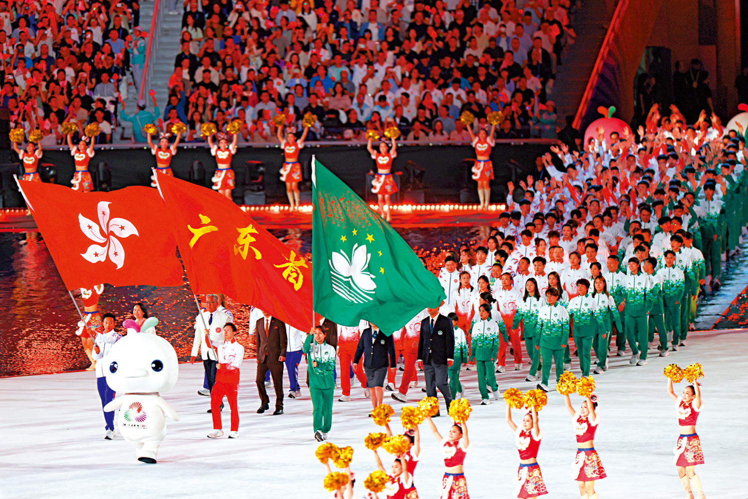 【大公報訊】記者盧靜怡廣州報道:開幕式上,國旗護旗隊邁着整齊劃一的步伐,昂首闊步走向國旗杆基座。同一時刻,遠在香港金紫荊廣場、澳門金蓮花廣場的升旗儀仗隊也在各自場地同時起步,步履鏗鏘有力、氣勢昂揚,三地同步升起五星紅旗。雖然身處不同地域、步操制式各有不同,但三地儀仗隊有着無需言說的高度默契,幾乎在同一瞬間行進至旗杆基座前,彷彿有一條無形的家國紐帶,將三地緊緊相連、心意相通。隨着一聲整齊劃一的指令,三地升旗手同時振臂揮展,鮮艷的五星紅旗伴着雄壯的國歌旋律,從旗杆底端緩緩攀升,直至頂端迎風飄揚。