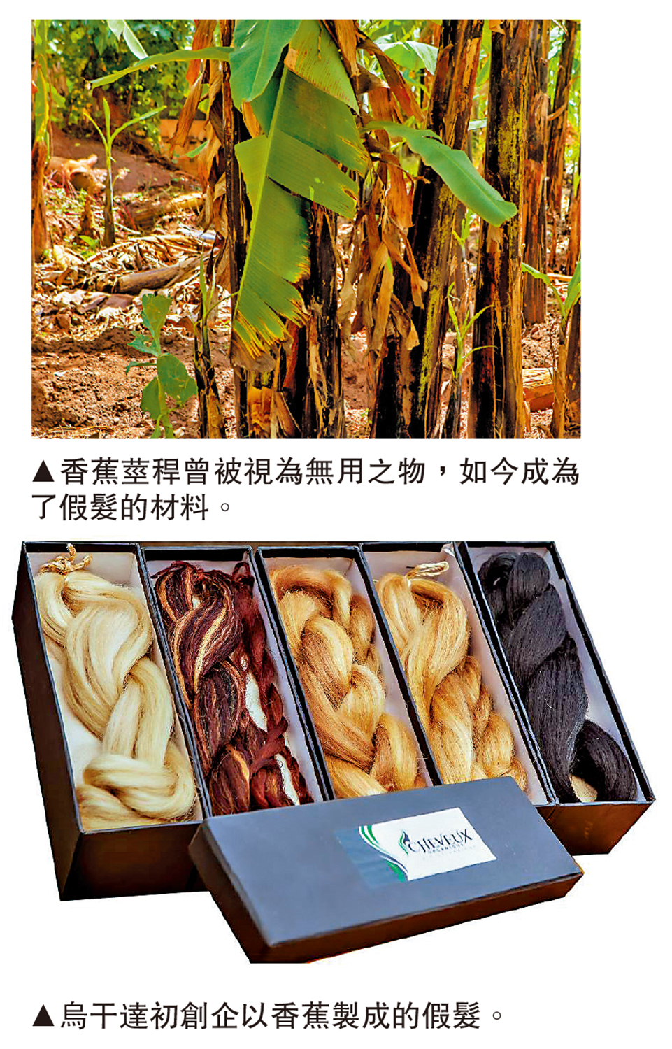 烏干達初創公司Cheveux Organique透過向農民收購被丟棄的香蕉莖稈,經過提煉、烘乾處理等步驟,利用其天然纖維開發出環保原料,編織成手感柔軟、具自然光澤的假髮。