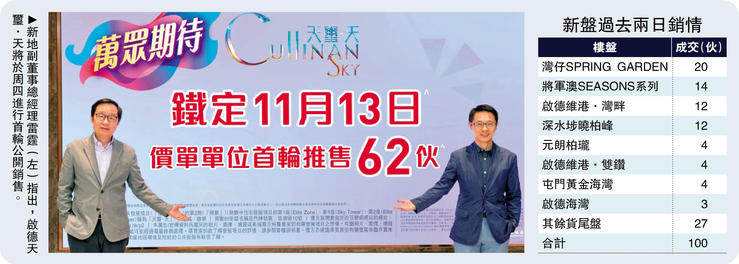 一手新盤今年銷情理想。臨近歲末,一手市場依然活躍,發展商推盤步伐未見放緩。新地(00016)昨日公布,啟德天璽·天將於周四進行首輪公開銷售,推出62個單位,並於周三截止認購登記。首輪銷售涵蓋1房至2房戶型,折實售價約656.3萬元起。而在過去周末,由於缺乏焦點新盤推售,一手市場僅錄得約100宗成交,較上周同期下跌約三分之一。/大公報記者 林志光