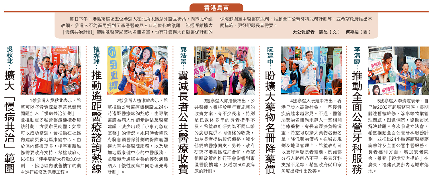 昨日下午,港島東選區五位參選人在北角地鐵站外設立街站,向市民介紹政綱。參選人不約而同提到了基層醫療與人口老齡化的議題,包括呼籲擴大「慢病共治計劃」範圍及醫管局藥物名冊名單,也有呼籲擴大自願醫保計劃的保障範圍至中醫醫院服務、推動全面公營牙科服務計劃等,並希望政府推出不同措施,更好照顧長者需要。\大公報記者 義昊(文) 何嘉駿(圖)