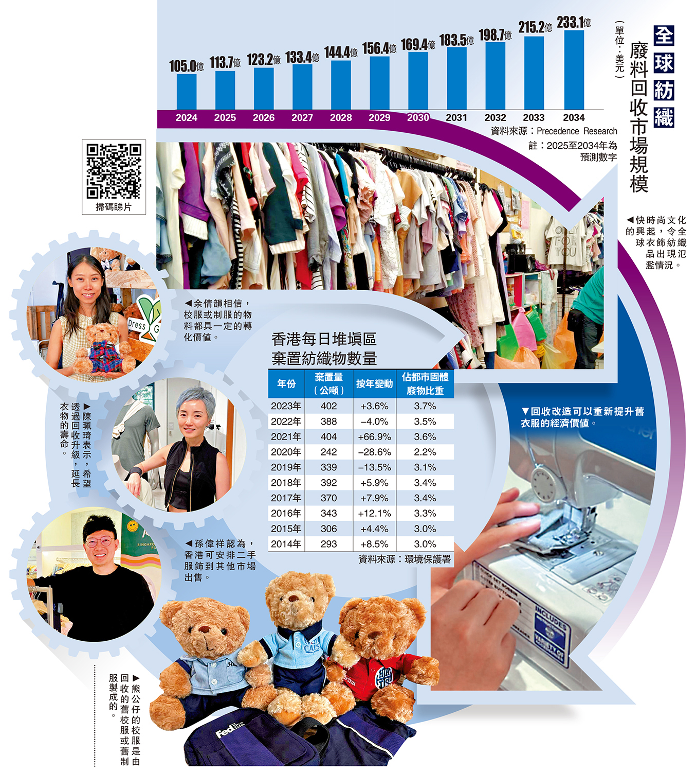 調研機構Precedence Research數據顯示,2024年全球紡織廢料的回收市場規模達105億美元(約819億港元),預計2034年將增至233.1億美元(約1818.2億港元),10年間的複合年增長率達8.3%。