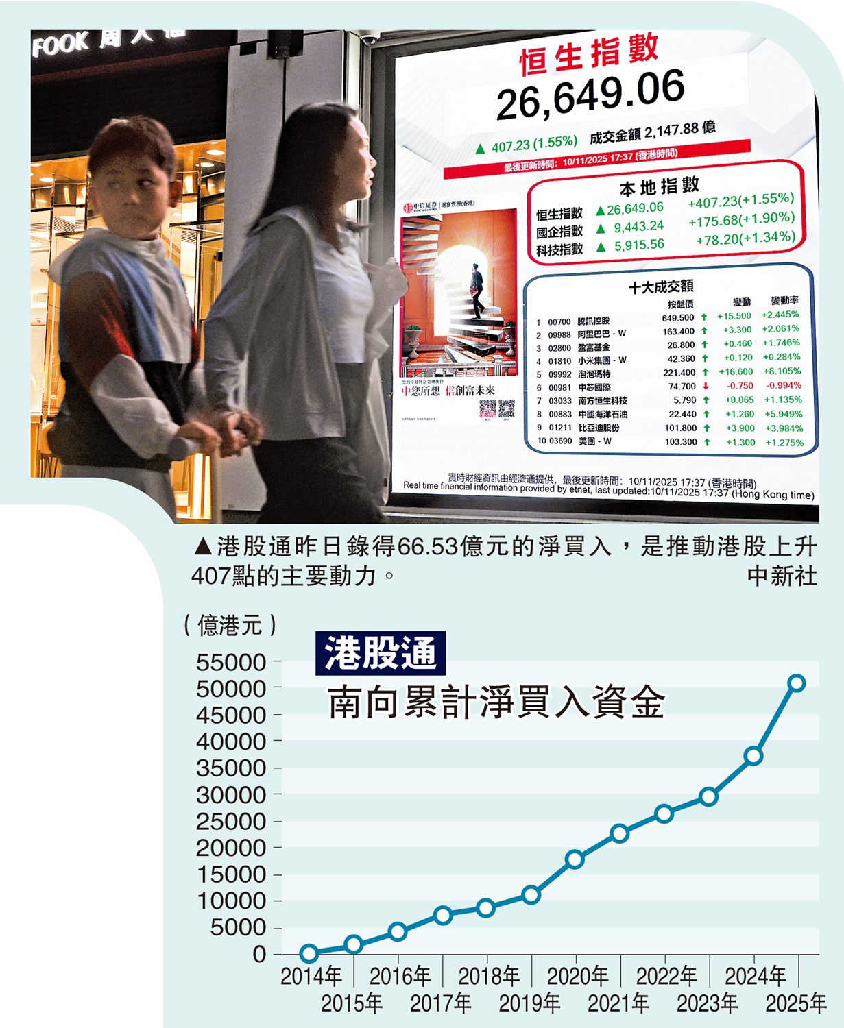 內地機構投資者及公募基金近年已成為港股重要購買力量。在昨日66.53億元淨買入下,港股通南向資金在年初至今淨買入突破1.3萬億元;自港股通2014年開通以來,累計淨買入港股規模首破5萬億元。整體大市方面,內地經濟數據令市場憧憬反內捲措施漸見成效,加上A股午後轉升,推動港股升407點。新消費股造好,泡泡瑪特(09992)股價升8.1%。\大公報記者 劉鑛豪