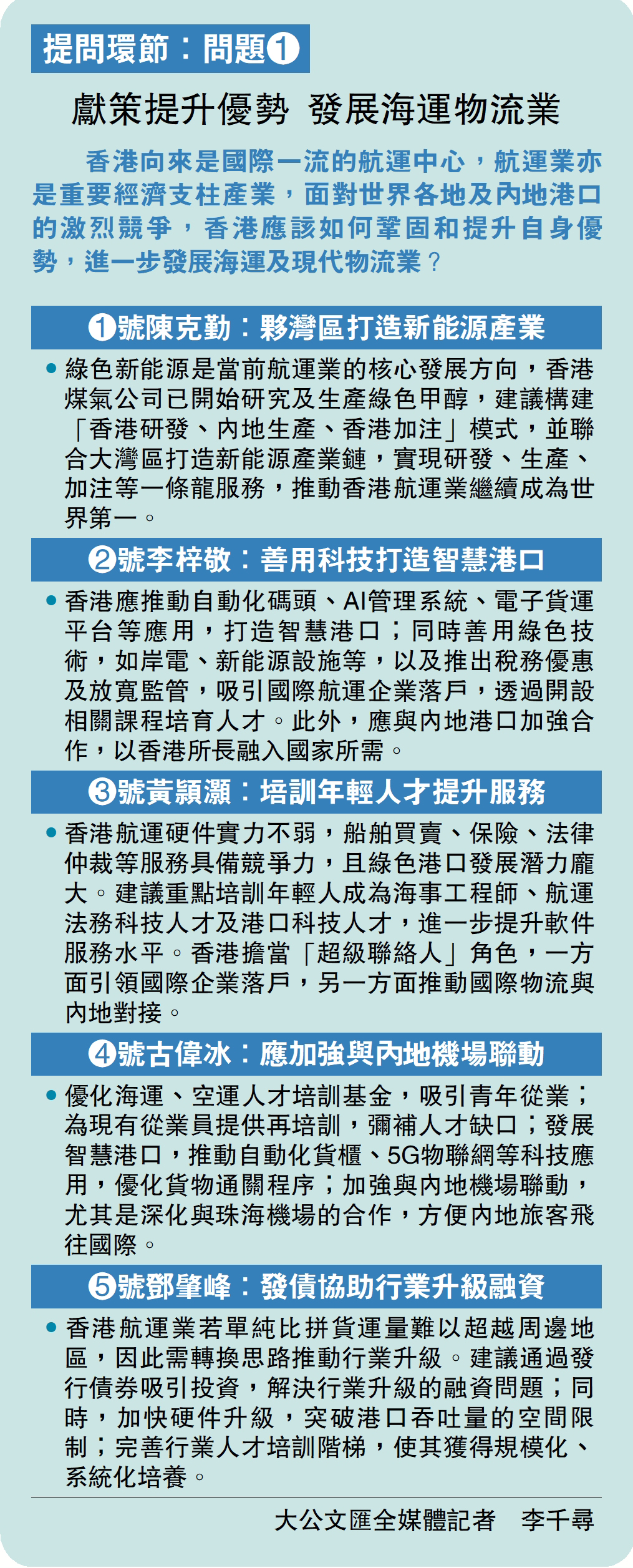 •香港應推動自動化碼頭、AI管理系統、電子貨運平台等應用,打造智慧港口;同時善用綠色技術,如岸電、新能源設施等,以及推出稅務優惠及放寬監管,吸引國際航運企業落戶,透過開設相關課程培育人才。此外,應與內地港口加強合作,以香港所長融入國家所需。