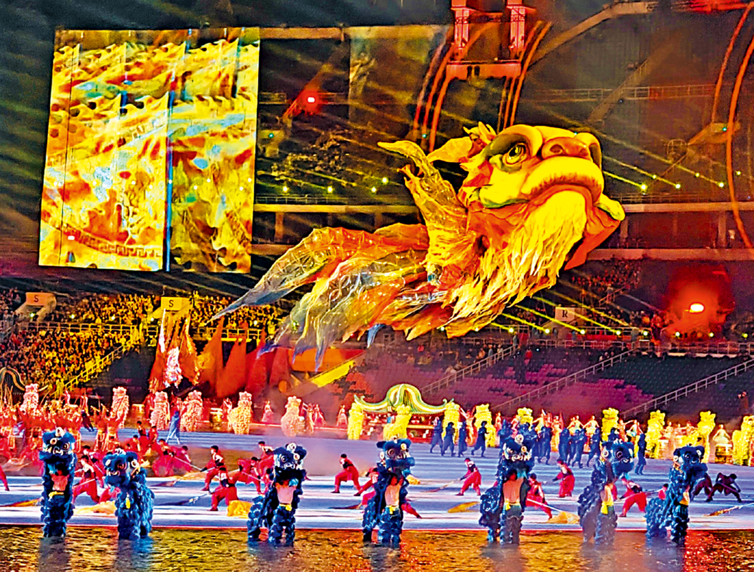 鰲魚在傳說中是「鯉躍龍門」化龍之前的過渡形態。《山海經》中,鰲魚是「背負蓬萊仙山」的神物,象徵着穩固與祥瑞;而在粵港澳地區的民俗文化裏,鰲魚更蘊含着「獨佔鰲頭」「如魚得水」等吉祥寓意。據介紹,這是首次在大型體育賽事開幕式中,用上「鰲魚」這一文化符號。
