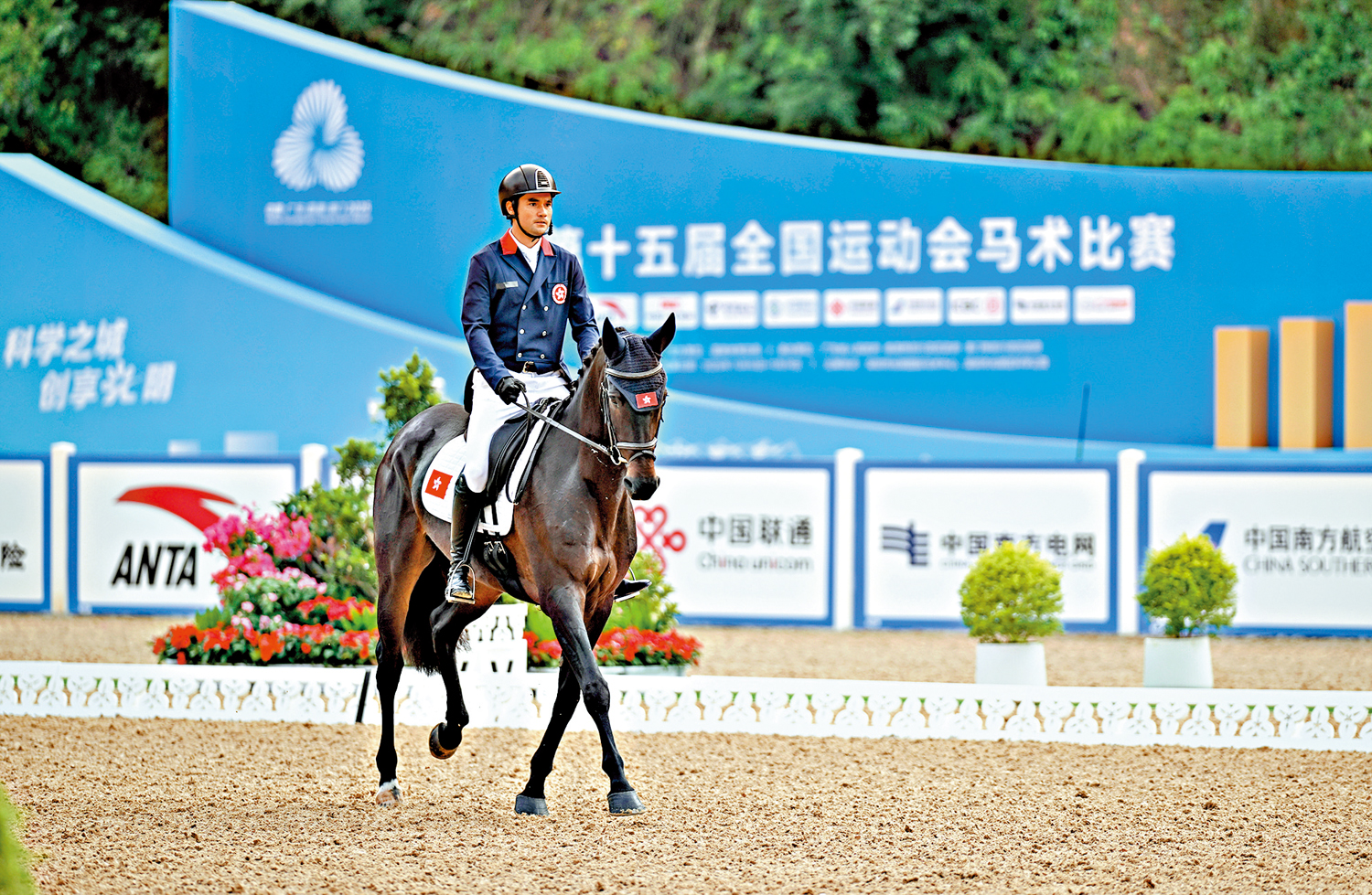【大公報訊】記者郭若溪深圳報道:13日,第15屆全運會馬術三項賽團體決賽暨個人資格賽在深圳開賽。在盛裝舞步項目角逐中,江蘇隊以總罰分91.9分的成績領跑團體賽,廣東隊騎手梁銳基搭檔馬匹「凱麗」以28.0分的總罰分暫列個人資格賽第1。香港隊的蘇昱軒以35.4的罰分排名第16,何誕華、吳蓓華分別排名第22、24。
