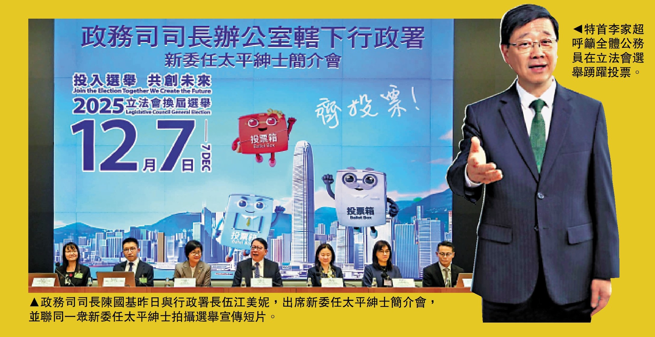 就在昨日,政務司司長陳國基在社交平台,發出聯同一眾新委任太平紳士拍攝的宣傳短片,呼籲社會各界積極參與12月7日舉行的第八屆立法會選舉;另一邊廂,公務員事務局局長楊何蓓茵邀請多名官員以家鄉話呼籲鄉親們在選舉日投票。
