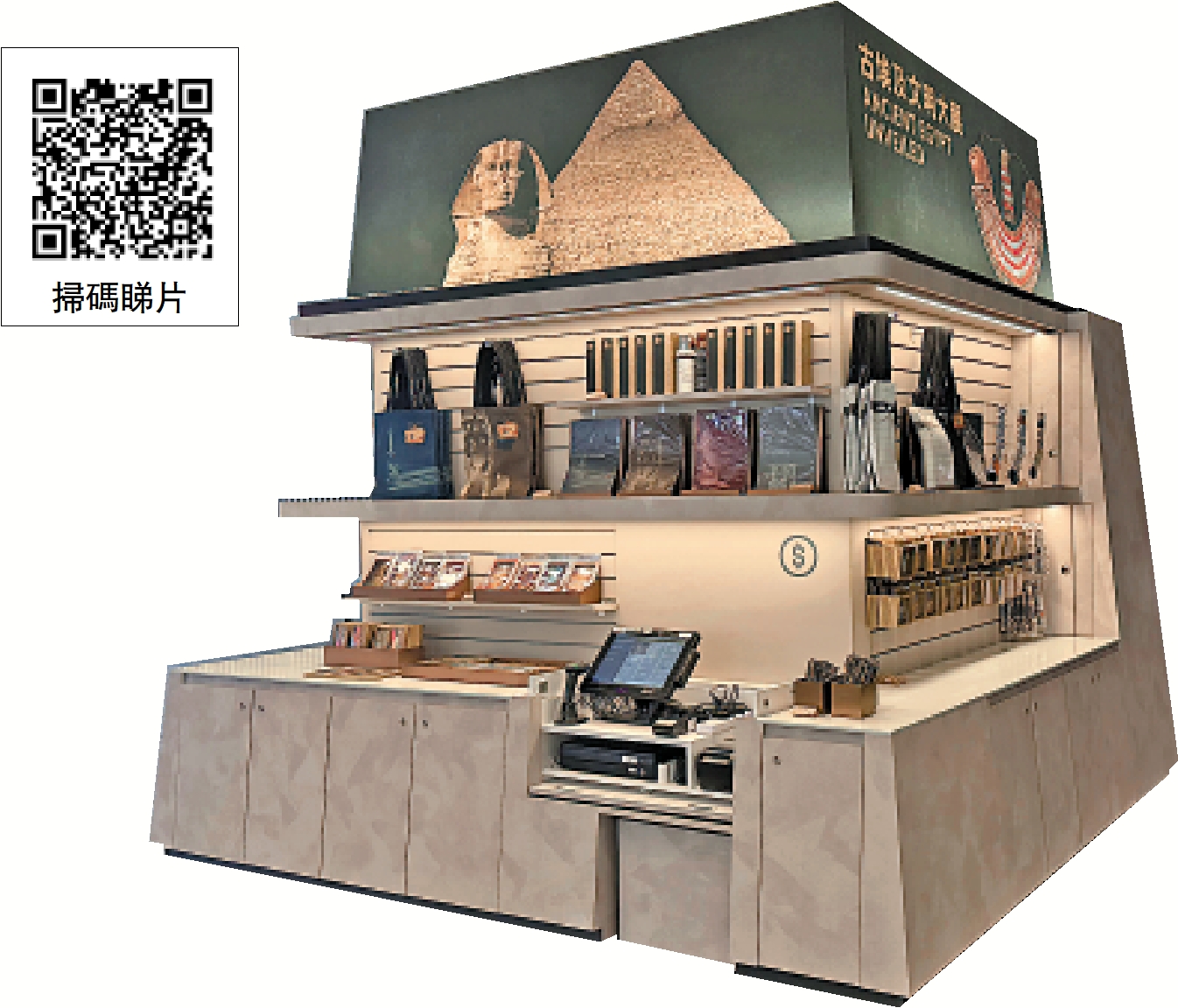 另一處文創商店位於四樓展廳正門旁,店門正對着一個以太陽色調設計的展板,整體裝潢延續了展廳的簡約風格。店內主打文物複製品與裝飾擺件,其中部分擺件由埃及製作並運抵香港,每件產品還會附上一張「出世紙」。黃恩棋指出,由於「出世紙」需以埃及文書寫,製作過程比以往更為繁複,因此這批商品屬於限量發售。