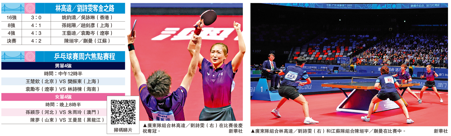 第15屆全運會乒乓球項目,14日晚上在澳門銀河綜藝館進行混合雙打決賽,由兩對國家隊「老少組合」對碰,代表廣東隊的男子世界冠軍林高遠,夥拍34歲「大師姐」奧運冠軍劉詩雯,面對江蘇隊兩位僅20歲及21歲的陳垣宇/蒯曼,結果林高遠/劉詩雯組合繼4強後再顯後上韌力,先落後局數0:2之下連取4局反勝4:2而贏得金牌。\大公報記者 譚德龍