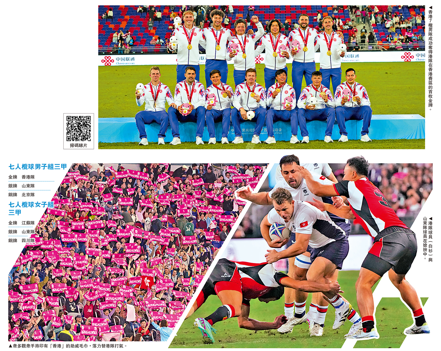 第15屆全國運動會七人欖球賽事於14日在啟德體育園主場館圓滿落幕,香港男子代表隊坐鎮主場出戰金牌戰,迎戰山東隊。兩隊上演了一場精彩十足的比賽,港隊下半場一度落後,但依靠于力仁和李卡度在後段時刻的關鍵達陣,最終港隊以26:19戰勝山東隊,成功奪得香港欖球隊歷來首枚全運會金牌。這枚金牌除了是港隊在香港賽區的首枚金牌、今屆第4金外,也是港隊在全運會首枚團體賽金牌,含金量十足。\大公報記者 張銳(文)、蔡文豪(圖)、楊嘯川(視頻)