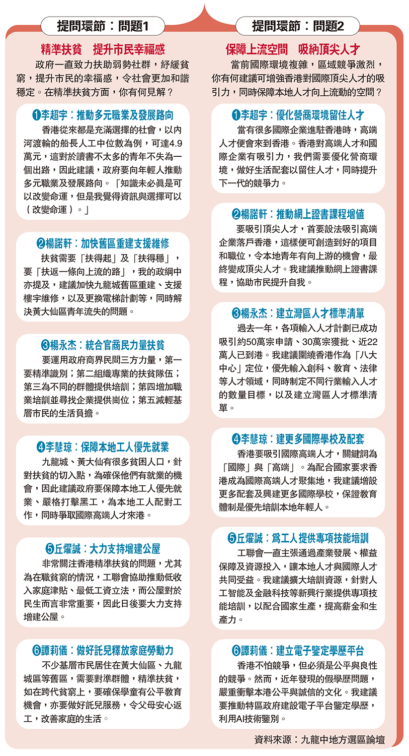 九龍城、黃大仙有很多貧困人口,針對扶貧的切入點,為確保他們有就業的機會,因此建議政府要保障本地工人優先就業、嚴格打擊黑工,為本地工人配對工作,同時爭取國際高端人才來港。
