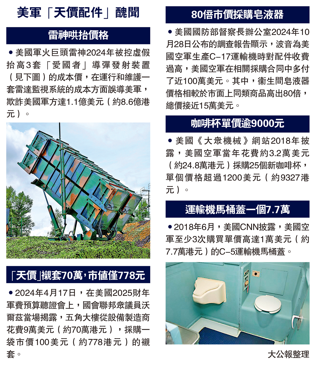 •2018年6月,美國CNN披露,美國空軍至少3次購買單價高達1萬美元(約7.7萬港元)的C-5運輸機馬桶蓋。