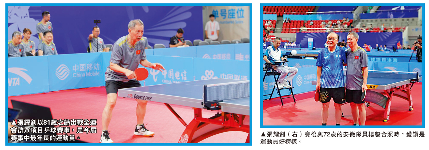 在今屆全運會的賽場上,張耀釗成為男子混合團體、70歲以上單打的港隊代表,雖然首戰以9:11、9:11直落兩局不敵電力體育協會代表,之後又以9:11、4:11負於安徽球手,但張耀釗認為代表各省隊出賽的都是高手,能夠向他們學習也是體驗的過程,而72歲的安徽隊員楊毅與張耀釗合照時,也大讚張耀釗是個好榜樣。