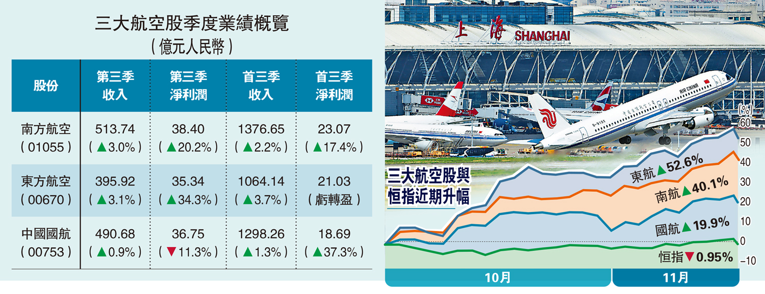 從三大航企第三季度業績切入,東航表現領先,其次是南航,再後是國航,而股價走勢亦證明這個觀點。於公布9月份經營數據的10月15日,直至公布季績後約一周時間(即11月7日),前述三家航空公司股價分別升37.3%、23.4%、14%。相對地,恒指、國指同期升3.1%、2%,航空股跑贏大市,顯示市場對投資價值有正面轉變。