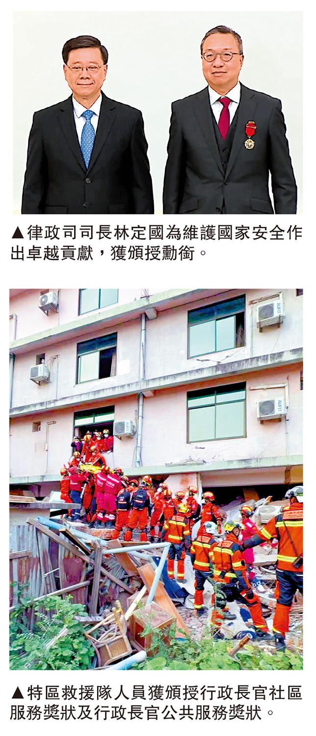 另外,去年4月10日在佐敦華豐大廈發生三級火警導致多人傷亡,當時兩位市民英勇協助救出多名受困居民,他們獲頒授銅英勇勳章;今年3月至4月期間,特區救援隊人員赴緬甸地震災區協助搜救工作,他們獲頒授行政長官社區服務獎狀及行政長官公共服務獎狀。