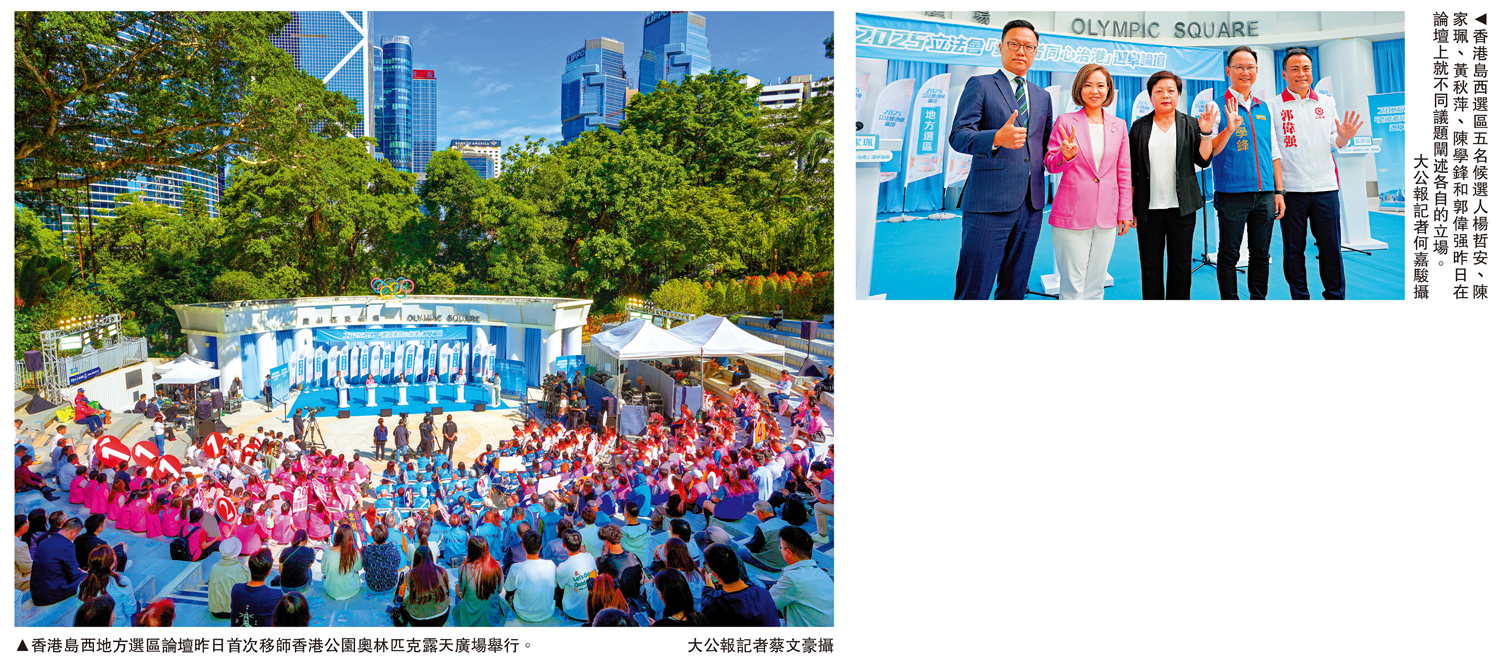 第八屆立法會選舉將於12月7日舉行,由特區政府舉辦的2025立法會「愛國者同心治港」選舉論壇踏入第五日。「港島西地方選區論壇」昨日(15日)上午於香港公園奧林匹克露天廣場舉行,五位候選人分別為1號楊哲安、2號陳家珮、3號黃秋萍、4號陳學鋒和5號郭偉强。他們圍繞自己的政綱,以及「促進種族共融」、「改善地區衞生」、「推動海濱旅遊」等議題展開討論。