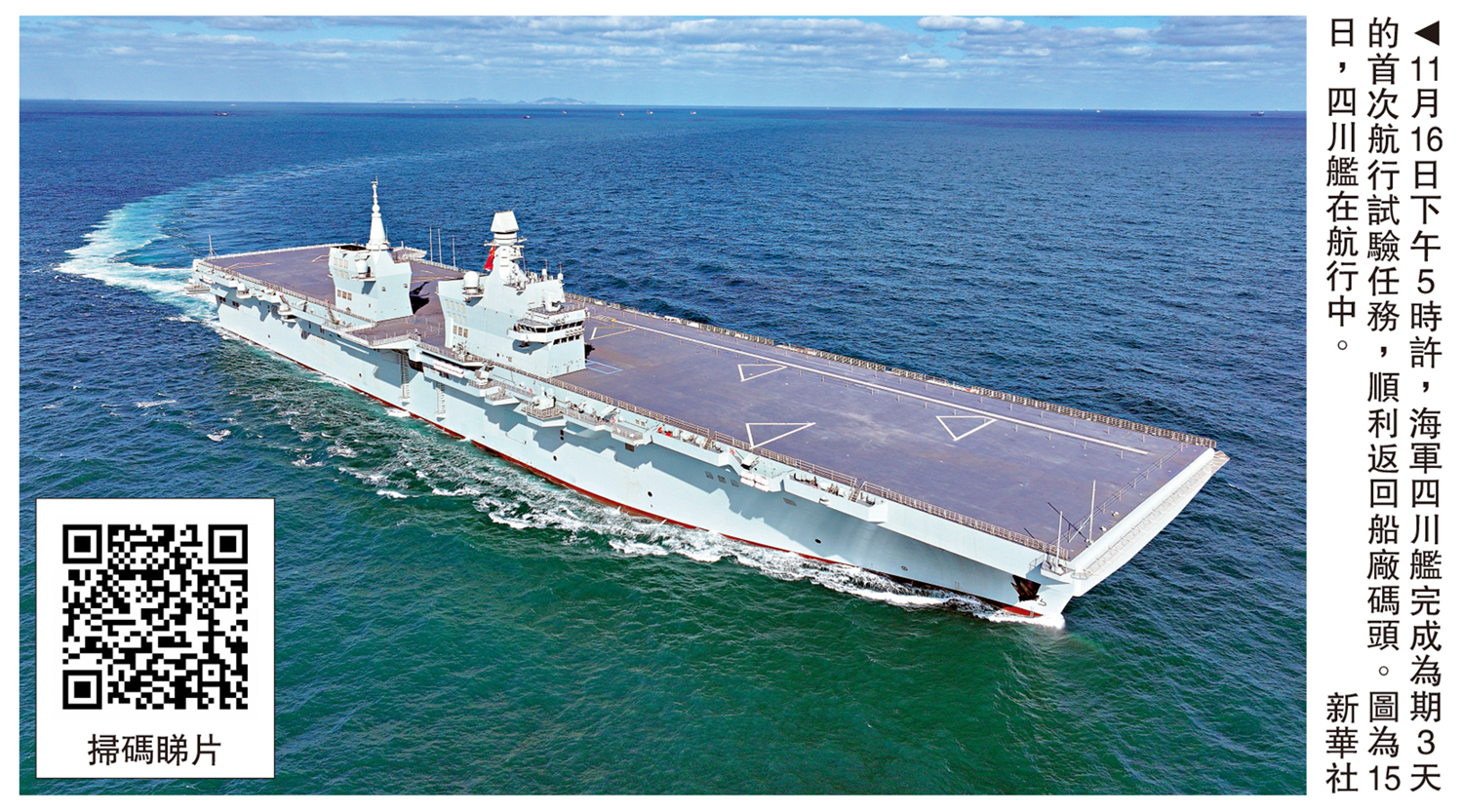 【大公報訊】據新華社報道:16日下午5時許,海軍四川艦完成為期3天的首次航行試驗任務,順利返回船廠碼頭。
