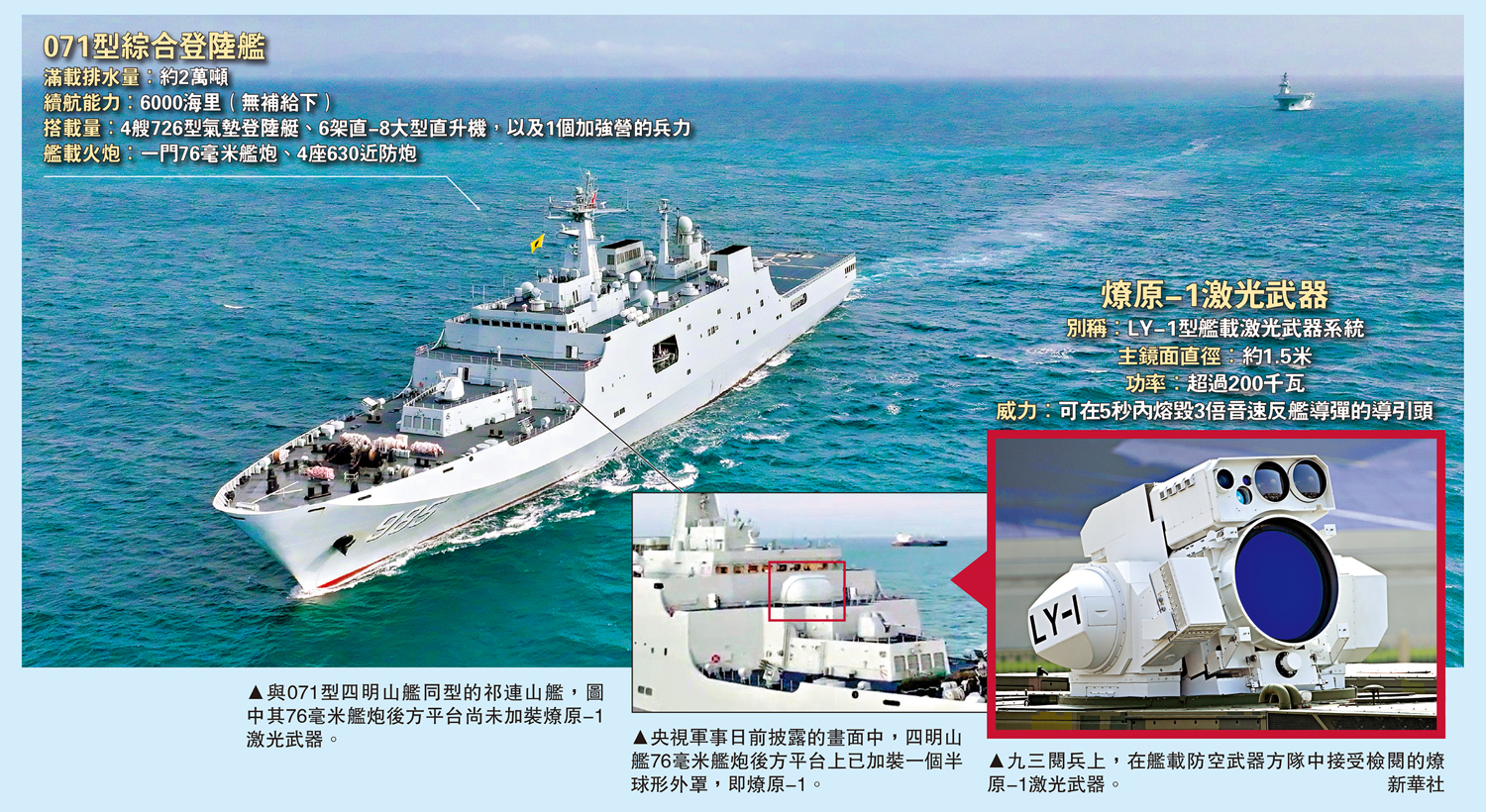 國產燎原-1型艦載激光武器系統,具有高功率、高精度、強毀傷等優點,曾在模擬對抗中於5秒內熔毀3倍音速反艦導彈的導引頭。目前,燎原-1已裝備於071型綜合登陸艦四明山艦上,成為全球首款實戰部署的艦載激光武器。