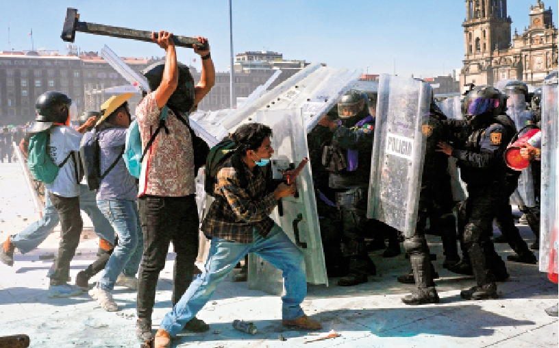 現場畫面顯示,大批示威者在國家宮殿外把部分鐵欄拉倒,衝向建築物外圍。防暴警員在宮殿範圍布防,施放催淚氣體驅散,部分年輕人向警方投擲物件,警方則以盾牌抵擋。墨西哥城治安負責人巴斯克斯表示有100名警員受傷,其中40人因擦傷及割傷須送院治療,另有20名示威者受傷。警方以涉嫌搶劫與攻擊等罪名拘捕20人。