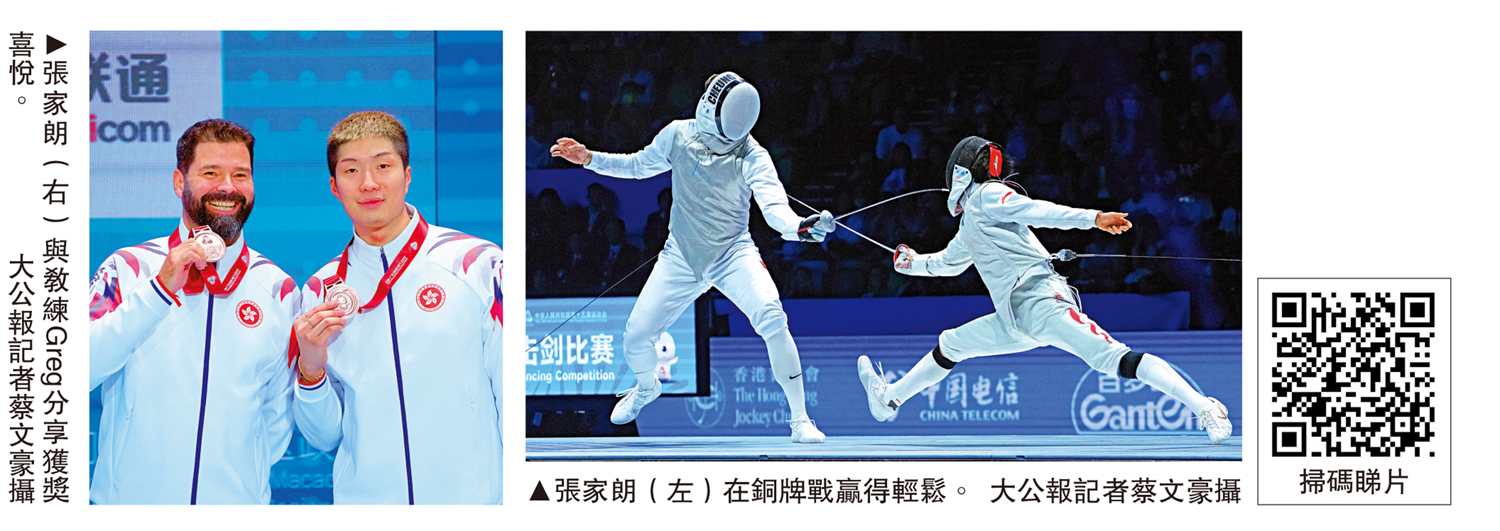 【大公報訊】記者張銳、楊嘯川報道:第15屆全運會劍擊項目16日在香港賽區啟德體藝館上演男子花劍個人賽,兩屆奧運會冠軍的「劍神」張家朗和應屆世界錦標賽冠軍的蔡俊彥主場出擊。昨天賽事門票售罄,主場氣氛熱烈,可惜蔡俊彥止步8強,張家朗則在4強落敗,但在銅牌戰僅花2分21秒便以15:2大勝以個人名義出戰的曾昭然,獲得銅牌,也是港劍擊隊本屆第3枚獎牌。
