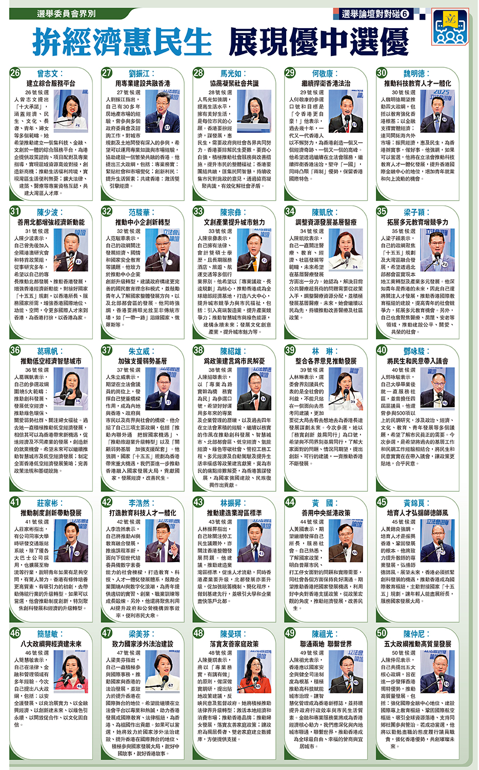 26號候選人曾志文提出「十大承諾」,涵蓋經濟、民生、文化、長者、青年、婦女等多個範疇。她希望推動建立一個集科技、金融、文創於一體的綜合服務平台,為港企提供政策諮詢、項目配對及專業指導,實現區域資源高效對接,創造新商機;推動生活福利跨境,實現灣區生活便利無憂;擴大法律、建築、醫療等專業資格互認,共建大灣區人才庫。
