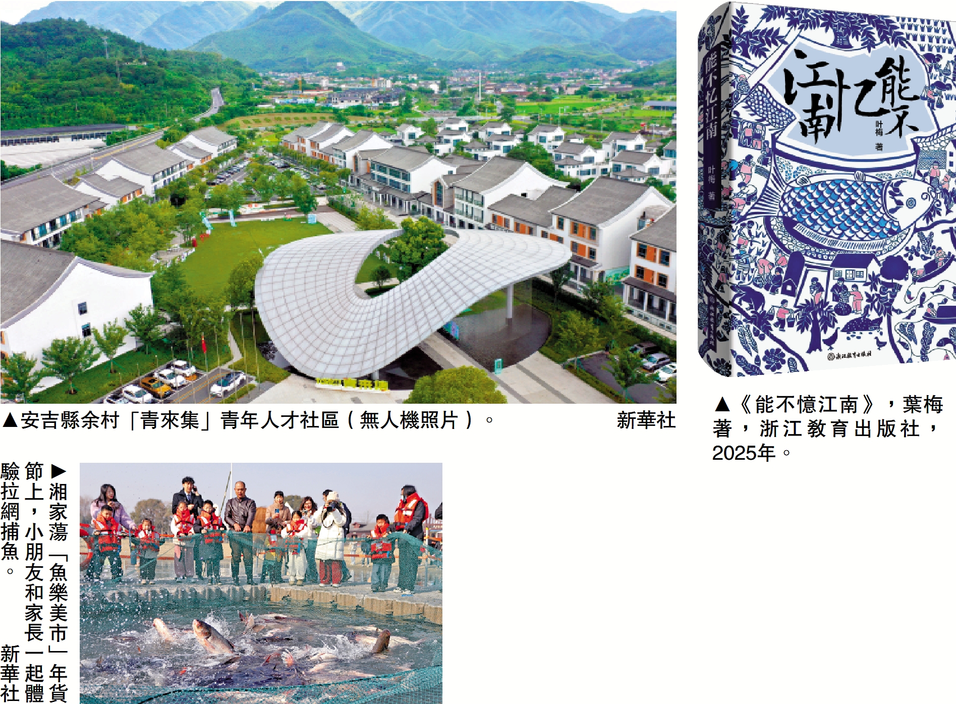 「黑色綢帶式的高速公路,蜿蜒穿梭,連綿起伏的綠色山巒,像一個個內心偉大而又祥和的巨人,平靜地守護着所有的生靈。田野裏,山坡上的大樹小樹,灌木叢,野草閒花,深淺不一的綠色親密地交織在一起,那是大自然與人相親相愛才能調配出來的色彩。」葉梅走訪浙江第一站就是安吉的天荒坪鎮余村。逐水而居的余村被天目山三面環抱,一條叫作滸溪的小河從村中穿過。《能不憶江南》開篇為讀者描繪「人與自然和諧共生」的絢爛溫暖的美好願景,一幅幅充滿江南韻味的山水畫次第映入眼簾。