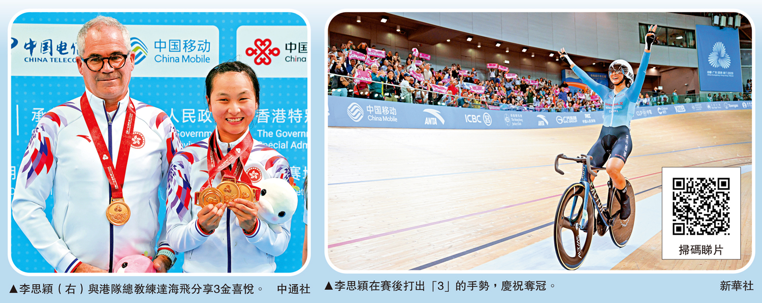 17日,香港代表團在第15屆全運會再創歷史。憑着李思穎在場地單車女子全能賽的金牌,以及何思蓓在游泳女子50米蛙泳和50米自由泳的銅牌,目前港團在十五運會競賽項目獲得8金2銀7銅,總獎牌超越歷屆最多的16枚。連同上屆的公路單車個人賽金牌,本屆歷史性共攬3金、24歲的李思穎在全運會累計奪得4金,超越此前共獲3金2銅的師兄黃金寶,成為港團在全運會史上的「金牌后」。\大公報記者 朱家立(文) 楊嘯川(視頻)