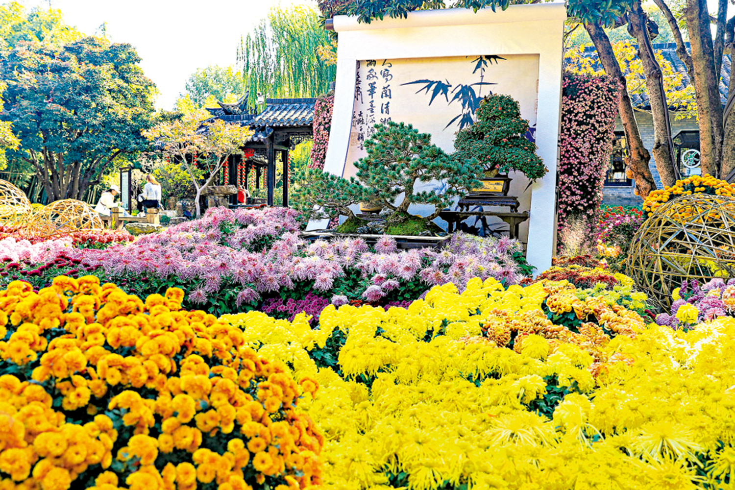 近日,人們在江蘇揚州个園景區「菊隱个園,四時閒趣」為主題的精品菊展上賞菊遊玩。\新華社