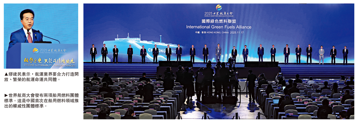 2025世界航商大會昨日在港舉行,招商局集團董事長繆建民出席活動時以《破壁立新 迎變致遠 共啟高質量可持續發展新航程》為題作主旨演講。繆建民指出,為推動航運業邁向更高質量與可持續的嶄新航程,他向全球航運參與者發出三項核心倡議:一是攜手構建更加公平合理的全球航運治理體系;二是推動構建公平、科學、合理的全球減碳規則;三是以港為融合創新的首選高地,構築包容、多元、健康的航運生態圈。\大公報記者 林靜文(文) 何嘉駿(圖)