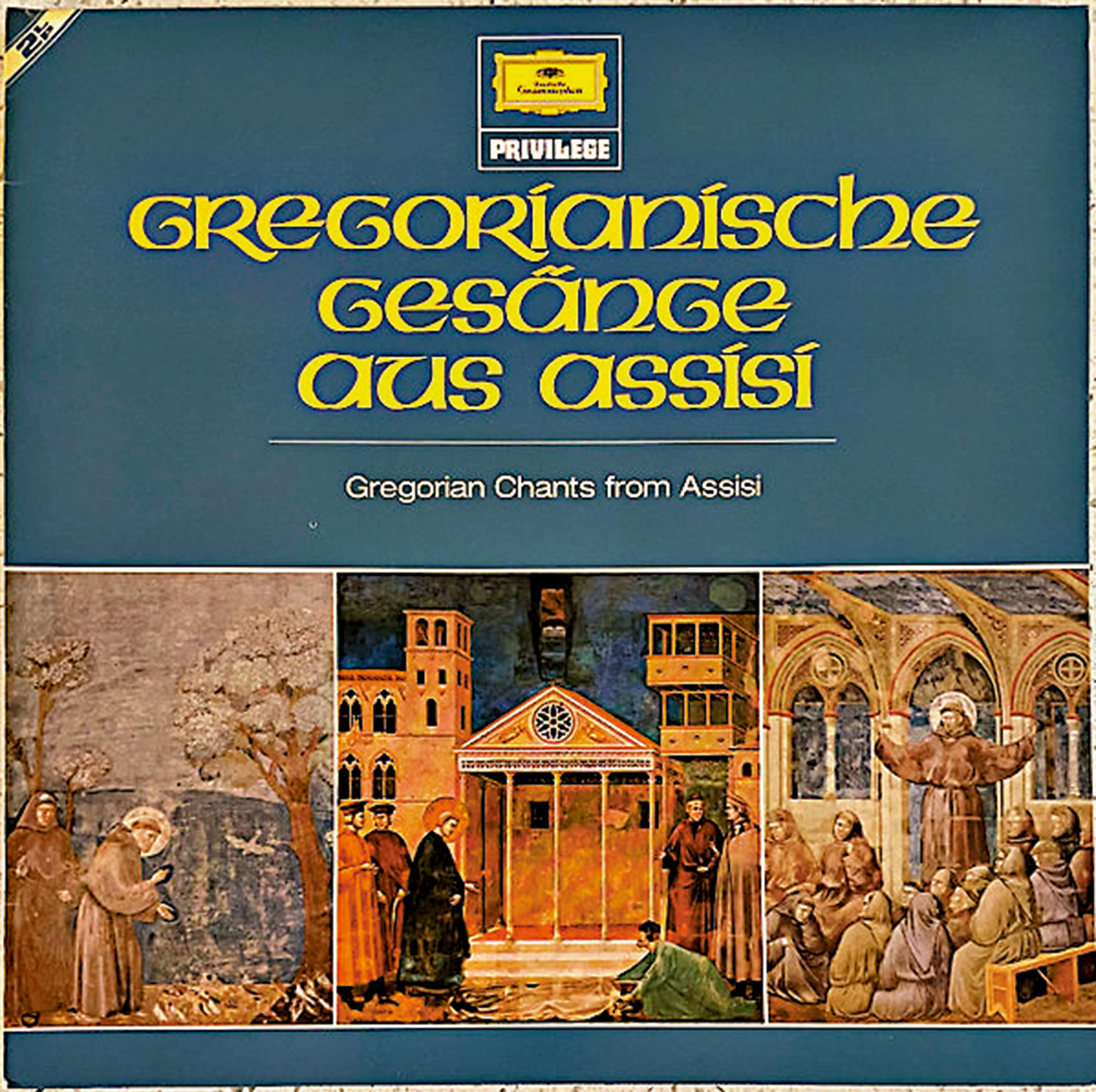 藉着到此一遊的熱乎勁,本周推薦一張以喬托為聖方濟各大教堂所繪濕壁畫為封面的唱片。專輯出自德意志留聲機唱片的「榮耀」系列,收錄了由阿方索·德爾·費拉羅神父執棒阿西西的聖方濟各合唱團所演繹的阿西西的《格里高利聖詠》。唱片封套從二十八幅喬托濕壁畫中選擇了三幅,從左至右分別是第十五幅《對鳥布道的聖方濟各》、第一幅《向普通人致敬》,以及第十八幅《在阿爾勒的禮拜堂顯靈》。