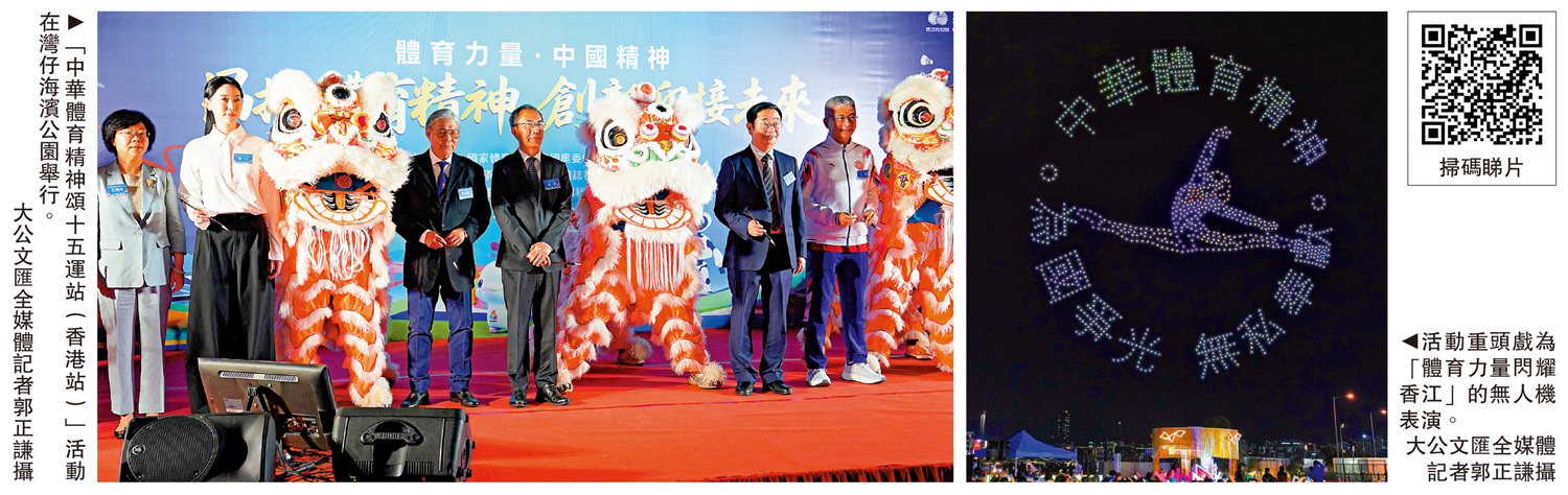 【大公報訊】大公文匯全媒體記者郭正謙報道:為弘揚中華體育精神、促進內地與香港的文化體育交流,由國家體育總局、中國奧委會及紫荊文化集團共同主辦的「中華體育精神頌十五運站(香港站)」18日假灣仔海濱公園舉行,活動除邀得奧運冠軍孫一文出席分享感受外,更有1200架無人機在維港夜空構建出全運吉祥物及多項運動圖案,為十五運會主辦城市之一的香港更添盛事氣氛。