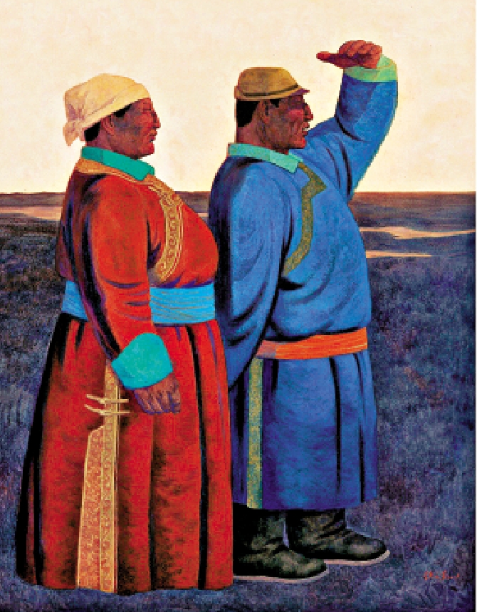 一入展場,便被《遠方》一畫吸引。這件大尺幅畫作曾在第十三屆全國美展斬獲金獎。畫面內容並不繁複,身着蒙古族服飾的一男一女佔去畫幅前景大半,相伴而立,凝神望向前方。背景簡約,一望無垠平原上隱約見到河水蜿蜒,靜靜流淌。畫家巧妙以側面剪影呈現畫中人物,線條利落而有力量;用紅、藍、綠等高飽和度的大面積色塊描畫人物衣飾,生動卻又不顯浮誇,由此傳遞出草原牧民性格中的淳樸與沉實。