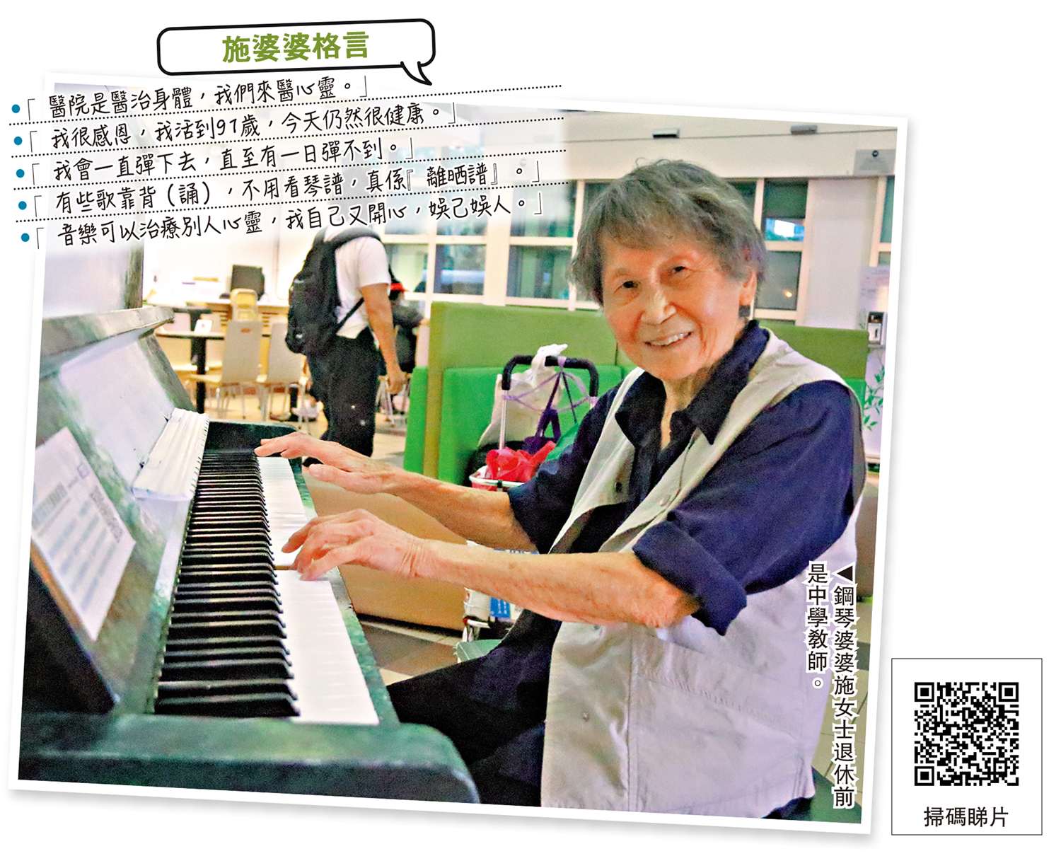 近日網上廣傳影片,北區醫院大堂有一位銀髮婆婆彈奏鋼琴,毋須看琴譜,輕鬆彈出多首樂曲,獲網民讚揚是「民間好琴音」。91歲的施婆婆近日接受《大公報》專訪,透露退休前是一位中學英文及音樂教師,最近兩年搬到北區醫院附近居住,為了紓解醫院探病人士情緒,選擇在下午探病時段公開演奏一小時,希望以音樂撫慰人心。\大公報記者 賴振雄(文) 調查組(圖、視頻)