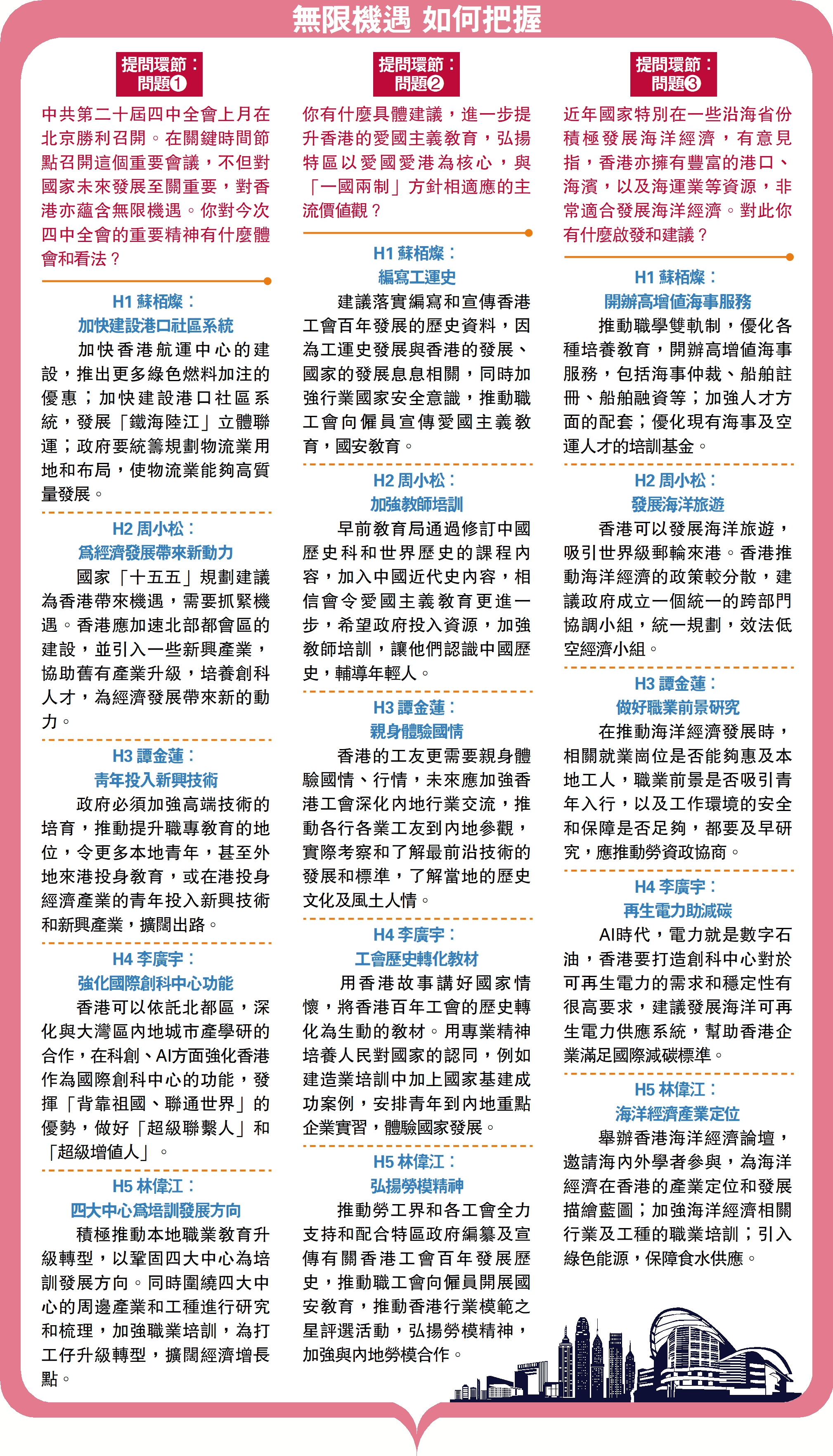 建議落實編寫和宣傳香港工會百年發展的歷史資料,因為工運史發展與香港的發展、國家的發展息息相關,同時加強行業國家安全意識,推動職工會向僱員宣傳愛國主義教育,國安教育。