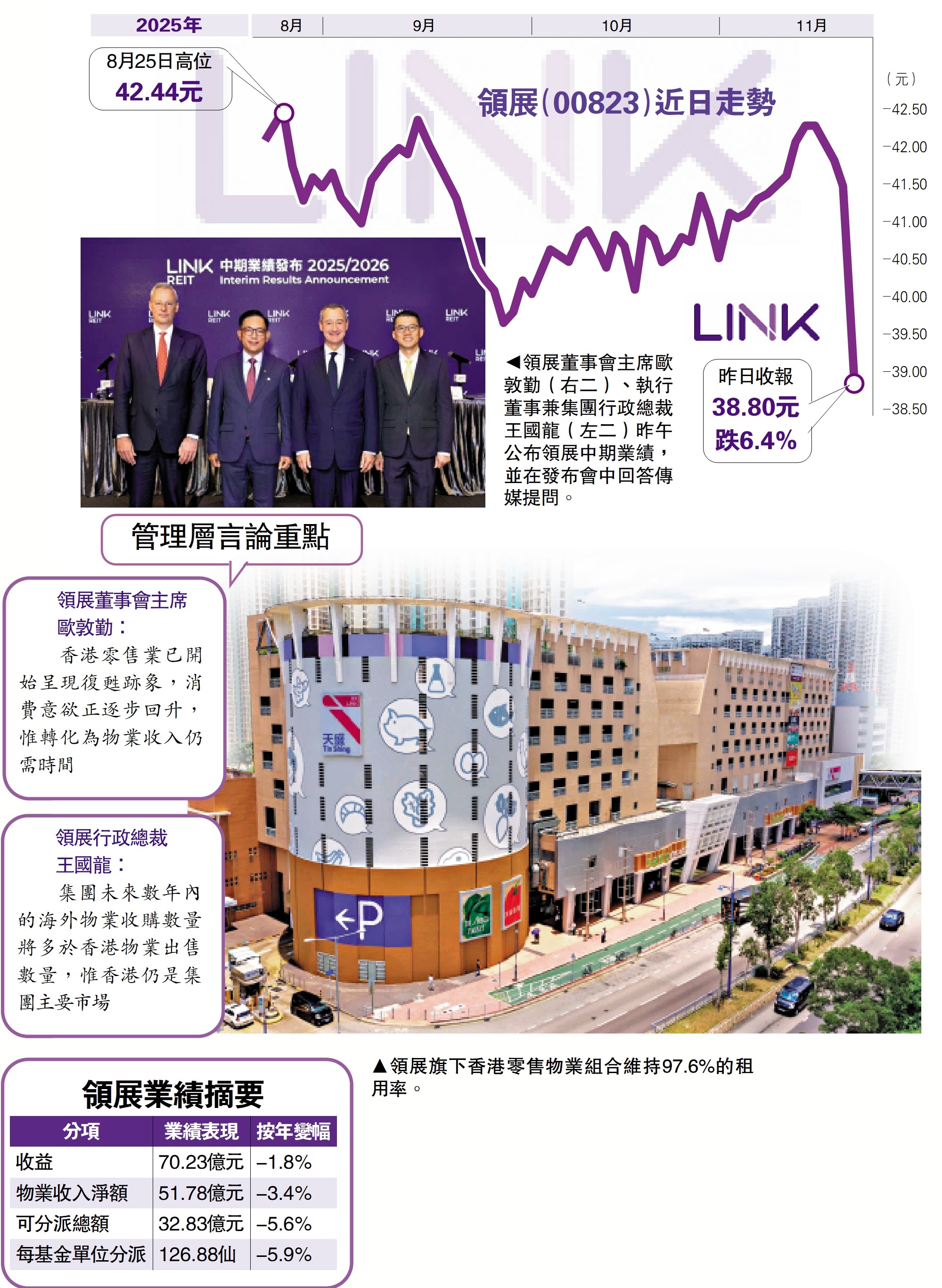 領展房產基金(00823)公布截至2025年9月底止中期業績,期內可分派總額下降5.6%至32.83億元,每基金單位分派126.88仙,按年跌5.9%;市場看淡業績表現,昨日收市跌6.42%,報38.8元。領展董事會主席歐敦勤表示,香港零售業已開始呈現復甦跡象,消費意欲正逐步回升,惟轉化為物業收入仍需時間。\大公報記者 蔣去悄