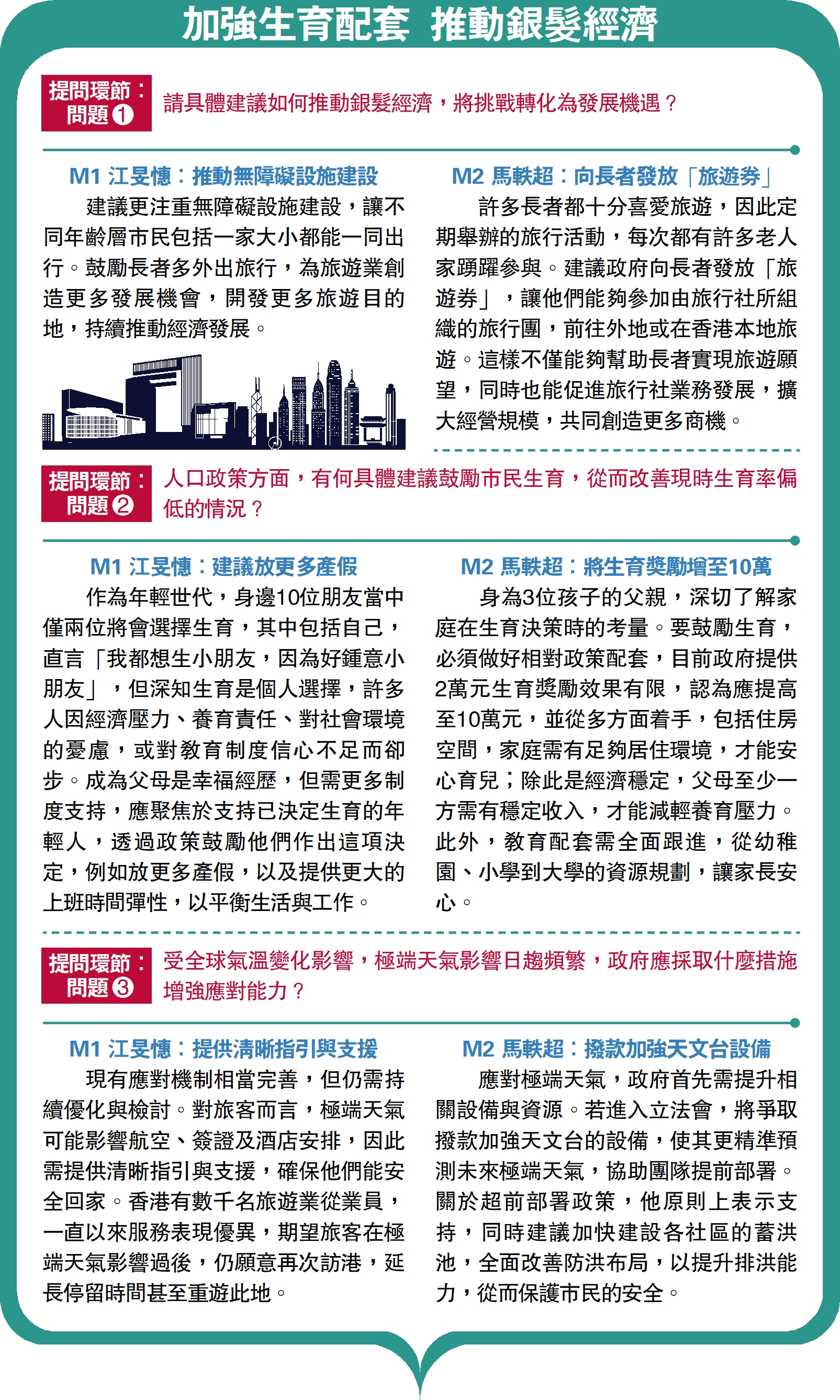 作為年輕世代,身邊10位朋友當中僅兩位將會選擇生育,其中包括自己,直言「我都想生小朋友,因為好鍾意小朋友」,但深知生育是個人選擇,許多人因經濟壓力、養育責任、對社會環境的憂慮,或對教育制度信心不足而卻步。成為父母是幸福經歷,但需更多制度支持,應聚焦於支持已決定生育的年輕人,透過政策鼓勵他們作出這項決定,例如放更多產假,以及提供更大的上班時間彈性,以平衡生活與工作。