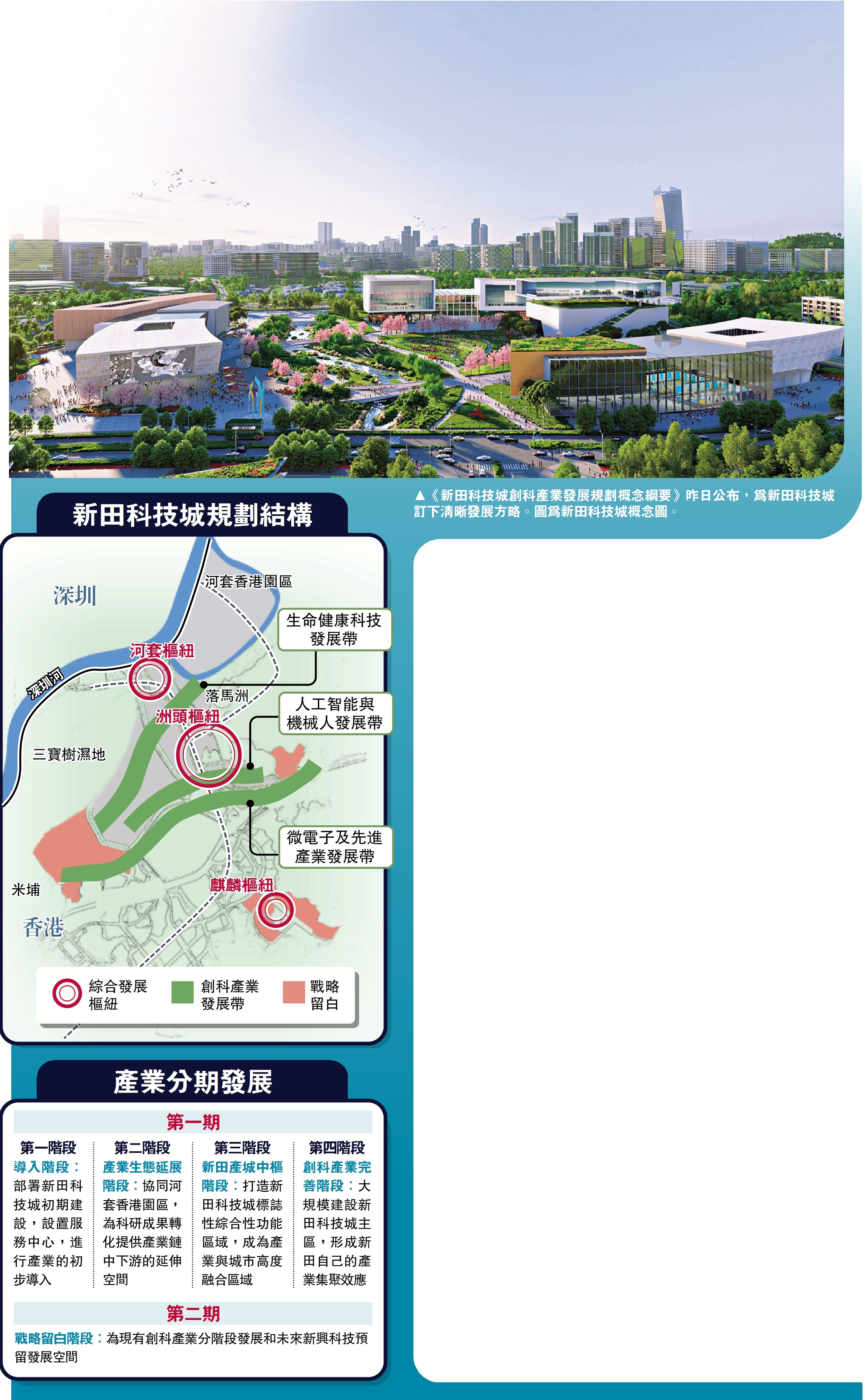 在推動每個階段發展時,都會以發展樞紐為核心統籌帶動,重點發展當地的主要先進產業,同時強調「產城融合」。除了引進企業設立總部、打造商業綜合體,還會規劃人才公寓,為創科人才提供各類城市配套。另外,規劃也會考慮實際情況,預留一定的發展彈性,設立戰略留白區,方便後續階段支援未來新興科技產業的發展。