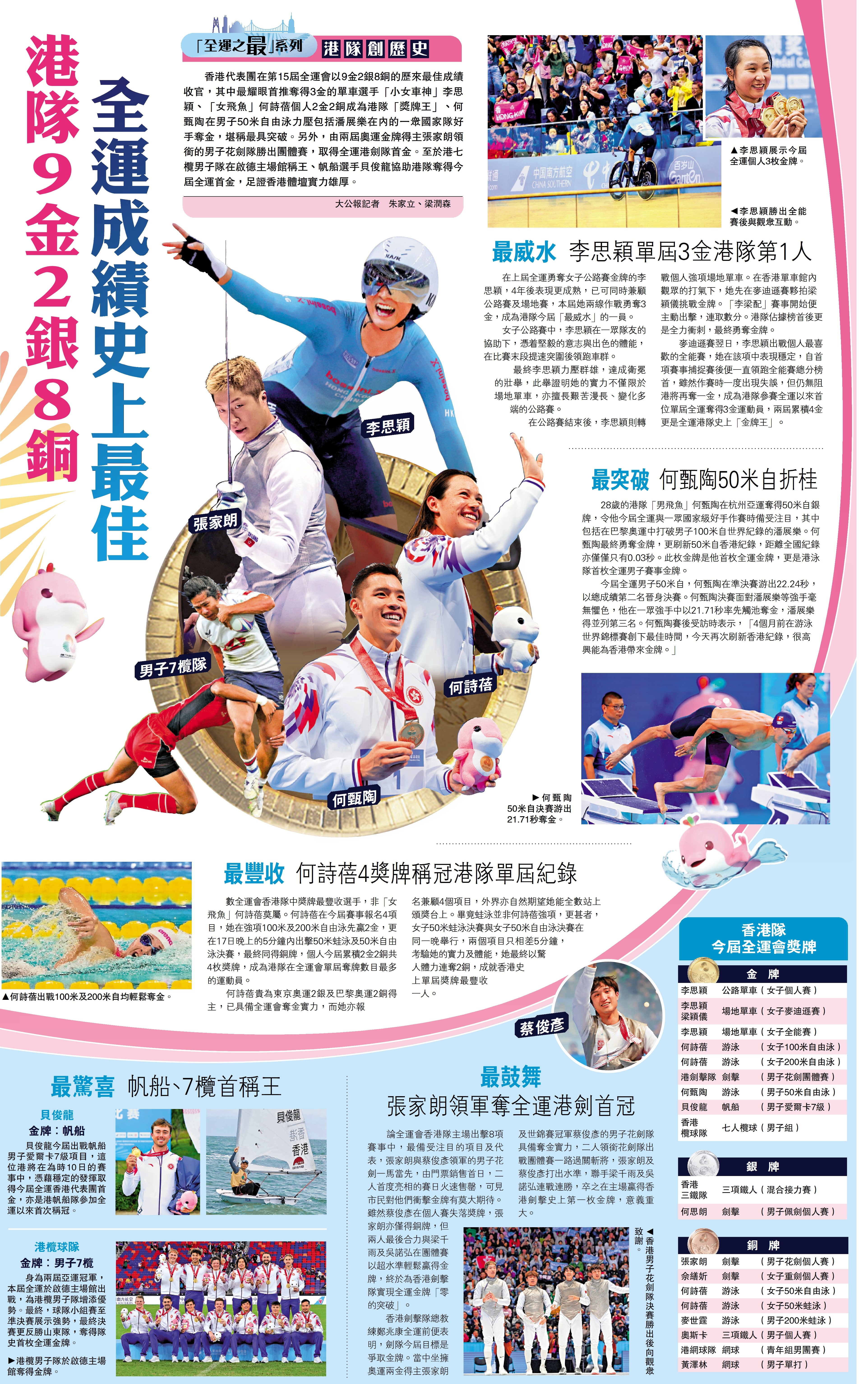香港代表團在第15屆全運會以9金2銀8銅的歷來最佳成績收官,其中最耀眼首推奪得3金的單車選手「小女車神」李思穎、「女飛魚」何詩蓓個人2金2銅成為港隊「獎牌王」、何甄陶在男子50米自由泳力壓包括潘展樂在內的一眾國家隊好手奪金,堪稱最具突破。另外,由兩屆奧運金牌得主張家朗領銜的男子花劍隊勝出團體賽,取得全運港劍隊首金。至於港七欖男子隊在啟德主場館稱王、帆船選手貝俊龍協助港隊奪得今屆全運首金,足證香港體壇實力雄厚。\大公報記者 朱家立、梁潤森