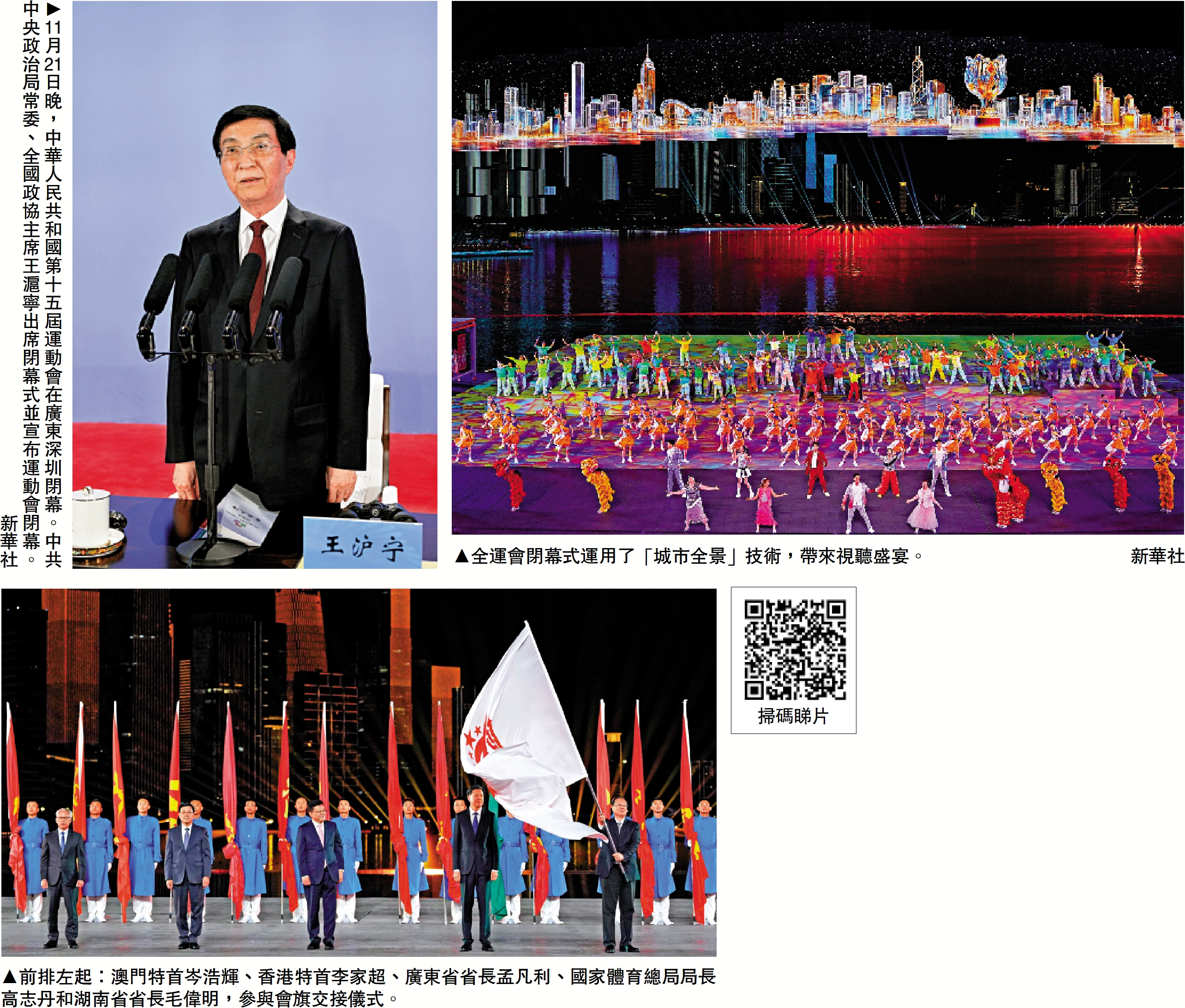 【大公報訊】廣東隊網球運動員王欣瑜、香港隊公路單車運動員李思穎、澳門隊空手道運動員郭建恆在閉幕式上,手手相連,共同開啟閉幕式的倒計時。在全運會裁判員代表團及37個運動員代表團進場後,粵港澳三地領導以及高志丹致辭後,王滬寧宣布第15屆全運會閉幕。