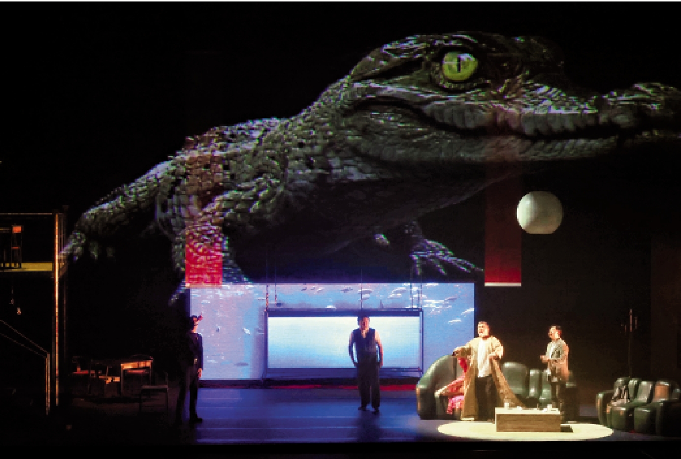 該劇舞台設計以一桌二椅為核心,配合側面的旋轉樓梯,簡潔而不乏象徵意味。開場時演員自觀眾席間現身後再走向舞台,拉近與觀眾的距離;多媒體影像則擴展了敘事空間,例如提及青雲大橋時,幕布投影即時呈現橋的影像。劇中象徵欲望的「鱷魚」亦以投影呈現,並會動作呼應劇情,使舞台在寫實與魔幻之間自然切換,將莫言筆下荒誕而尖銳的世界具象化。此外,莫言提到劇中音樂在塑造氣氛上有關鍵作用。他笑言自己「不懂音樂」,但仍明顯感受到音效與「鱷魚」之間的緊密配合:「一旦鱷魚要出現,這個音樂就會變得突然,讓人感覺到心頭、耳朵邊『一震』。」他認為音樂雖然在話劇中地位不如歌劇那麼重要,但仍能「對刻畫人物的內心起到很好的烘托作用」。