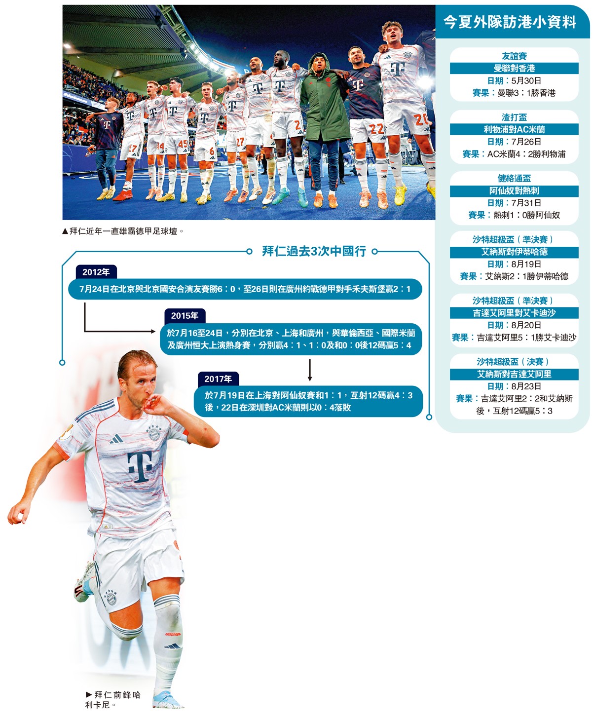 香港足球迷今年暑假現場欣賞到多支世界級勁旅前來獻技,這股外隊訪港熱潮明年夏天有望持續。近日盛傳德甲班霸拜仁慕尼黑,將於2026年8月到訪中國,屆時中國香港亦會是其中一站。而明年世界盃將於6月至7月舉行,這意味香港球迷屆時欣賞四年一度國際球壇盛事之後,馬上可以在港一睹世界級球星獻技及風采。\大公報記者 梁潤森