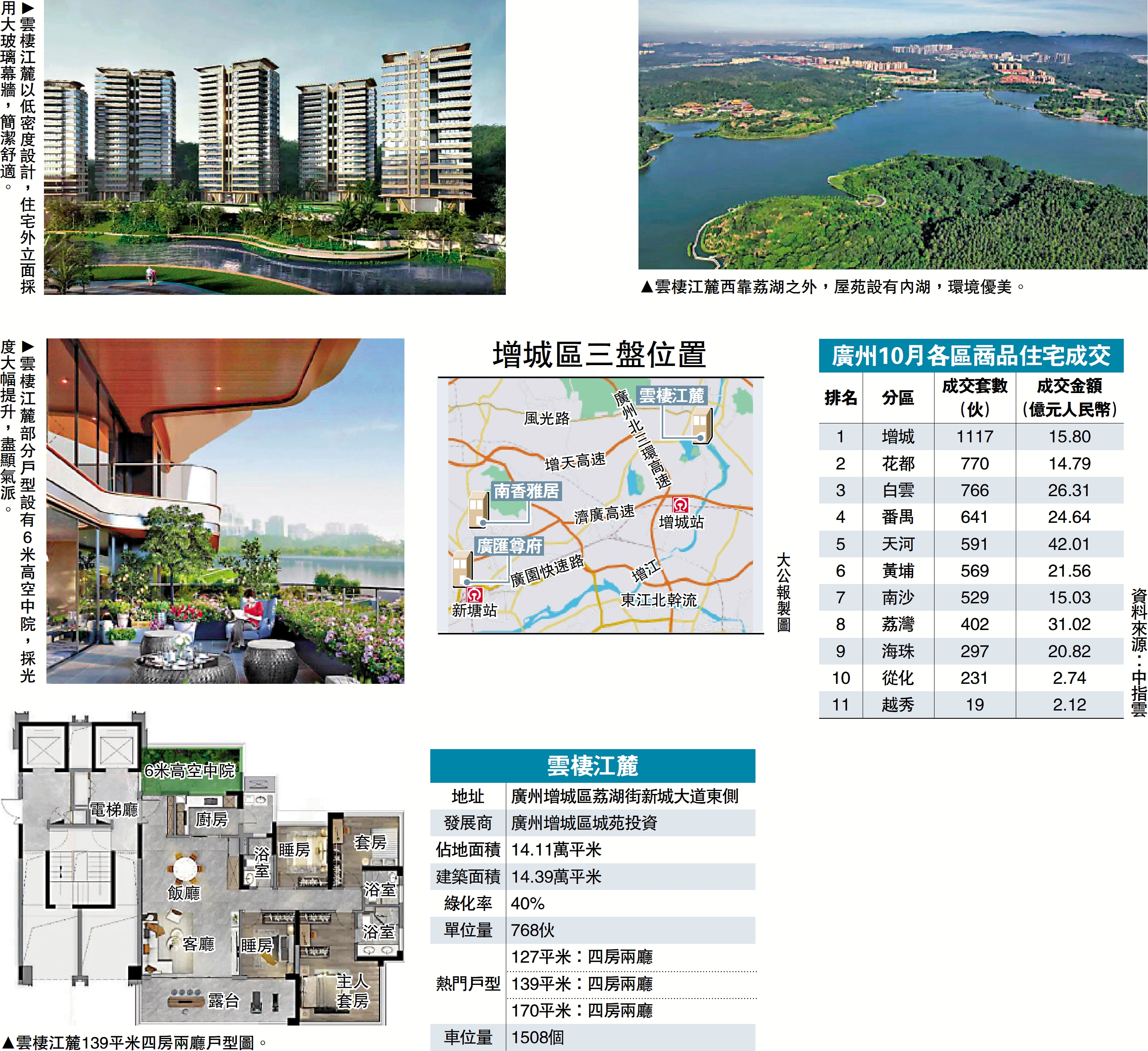 增城區作為廣州新盤供應重鎮,新世界中國、保利發展、越秀地產、城投集團、華潤置地等品牌房企紛紛在區內布局,東部中心建設持續提速。其中位於荔湖新城板塊的雲棲江麓尤為矚目,憑藉稀缺湖景資源與地積比率僅1.02倍的低密度設計,成為本季度增城區樓市焦點。\大公報記者 盧靜怡廣州報道
