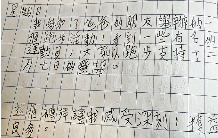 昨晚《大公報》收到一則小朋友即日撰寫的日記(見圖):「我參加了爸爸的朋友舉辦的一個跑步活動,看到一些有名的運動員,大家以跑步支持十二月七日的選舉。這個禮拜讓我感受深刻,獲益良多。」