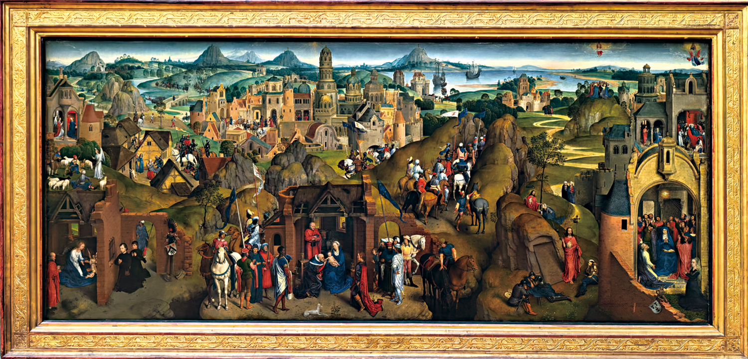 不僅如此,上述兩幅相隔十年的「宗教連環畫」展現了梅姆林在構圖側重點上的進化:《基督受難圖》以頂天立地的耶路撒冷建築群為主,風景被擠壓地僅有極小部分。而《聖母七喜樂》最大的亮點便是畫作背景精妙絕倫、以視野寬闊的廣角呈現的自然風景。和《基督受難圖》以建築用於間隔情節的方式不同,「七喜」中的建築多用於凸顯場景的重要性,獨立的敘事章節則用綿延的山石和蜿蜒的道路分隔開。在風景畫尚未「獨立成派」的十五世紀,梅姆林此作顯然已將風景置於陪襯之上,成為宗教題材作品中劃分敘事情節的重要自然「屏障」。青綠色的遠山、河流、湖泊,像極了我國傳統的青綠山水。加上中西方關於「異時同圖法」的共性,可以明顯看出北方文藝復興時期的尼德蘭繪畫有着和我國石窟及寺廟宗教壁畫異曲同工的創造力和技法。說明當人類文明發展到相似高度時,這種「宗教連環畫」的藝術形式實際上是中西方共通的。