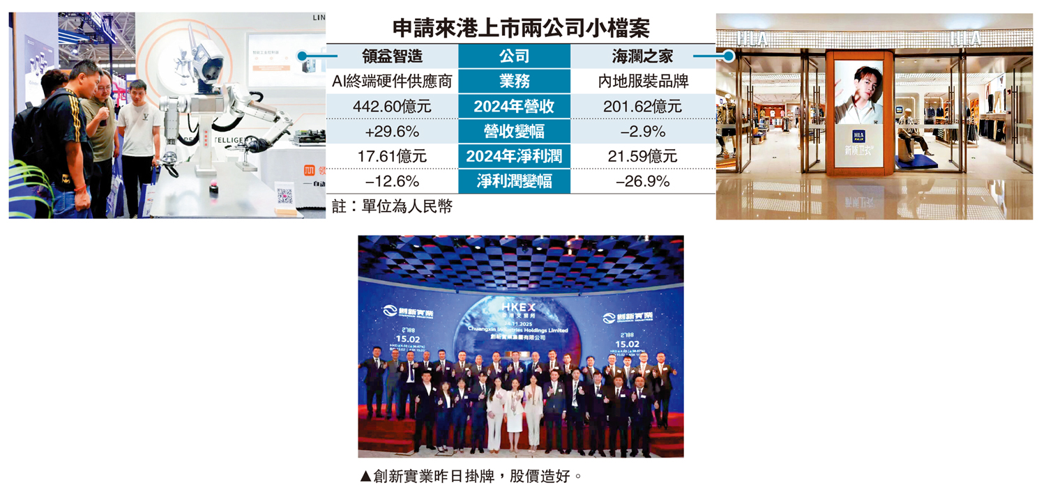 另一隻已經遞表申請在港上市的公司,為在上海證券交易所掛牌的內地服裝品牌海瀾之家(600398),華泰國際為獨家保薦人。根據弗若斯特沙利文資料,2024年海瀾之家位列內地服裝集團營收排名第四,截至今年6月底,該公司在內地經營5631家門店,海外市場門店有92間。該公司除男裝外,其自有品牌包括輕奢女裝品牌OVV及高端嬰童裝品牌英氏。截至今年6月底止半年,海瀾之家收入錄得112.38億元,按年增長3%,利潤則下跌3.1%至15.88億元。