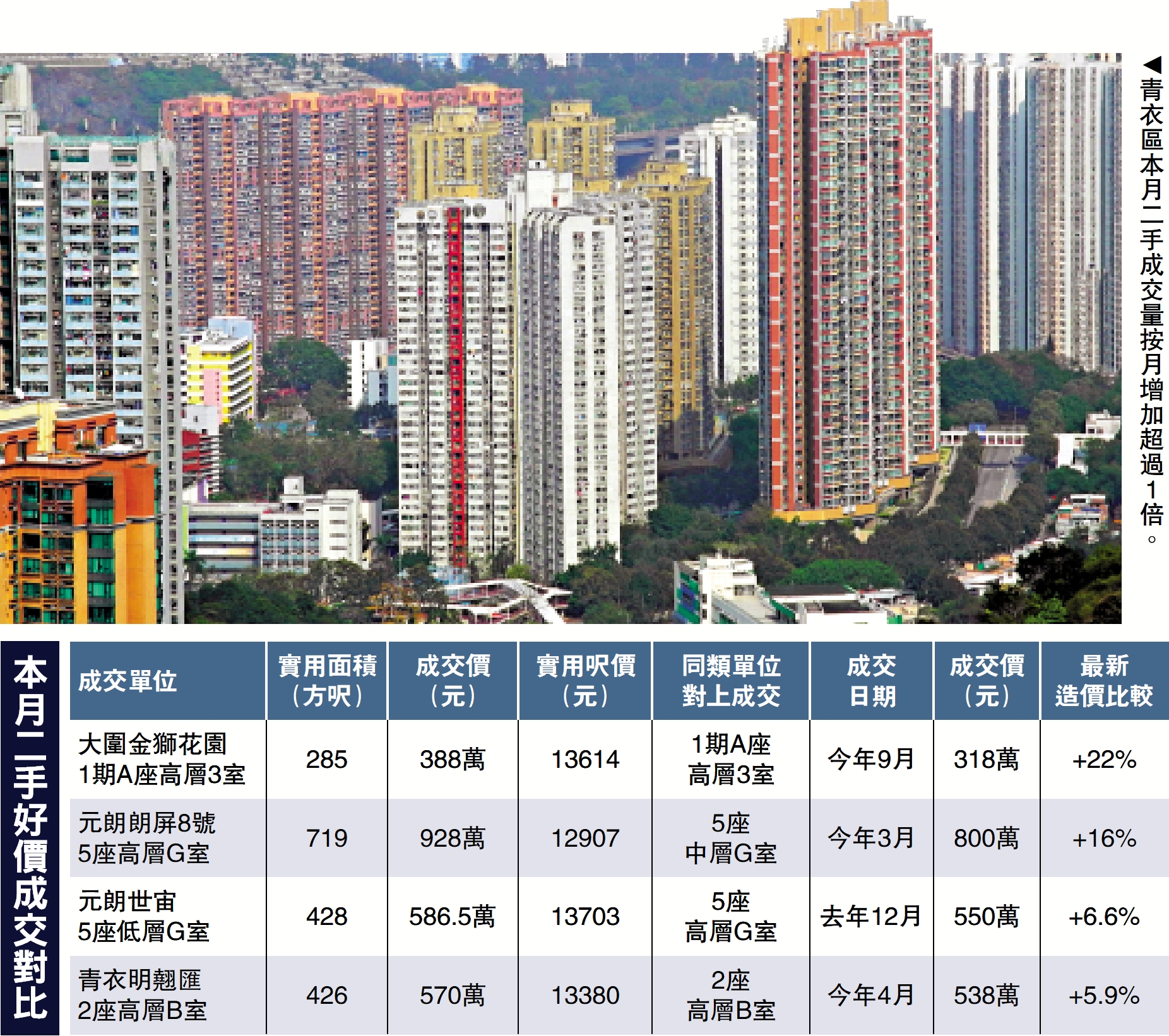 新盤持續熱賣,帶旺市場氣氛,二手購買力釋放,多個熱門上車重鎮交投增加,其中青衣區本月成交量倍升至60宗;元朗區本月交投量更突破100宗,按月升超過三成。市況回勇,屋苑造價明顯反彈,其中元朗朗屏8號的3房單位造價短短8個月差距逾百萬,升幅達16%。展望後市,中原集團創辦人施永青預計,本港樓價3年內從低位反彈逾四成,料升浪可持續長達6年。\大公報記者 林惠芳