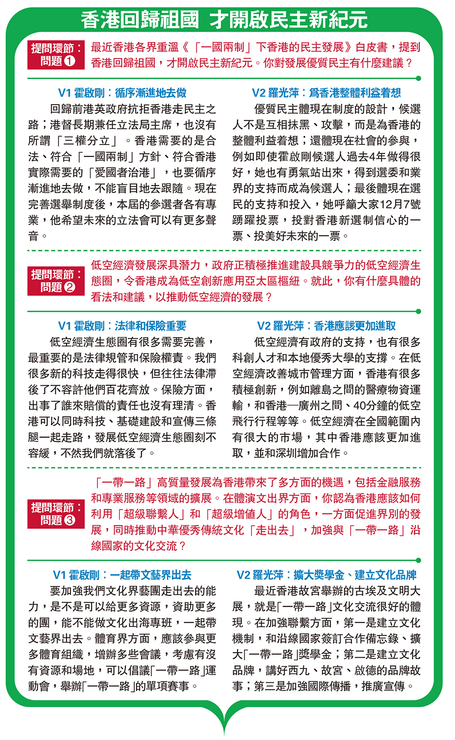 優質民主體現在制度的設計,候選人不是互相抹黑、攻擊,而是為香港的整體利益着想;還體現在社會的參與,例如即使霍啟剛候選人過去4年做得很好,她也有勇氣站出來,得到選委和業界的支持而成為候選人;最後體現在選民的支持和投入,她呼籲大家12月7號踴躍投票,投對香港新選制信心的一票、投美好未來的一票。