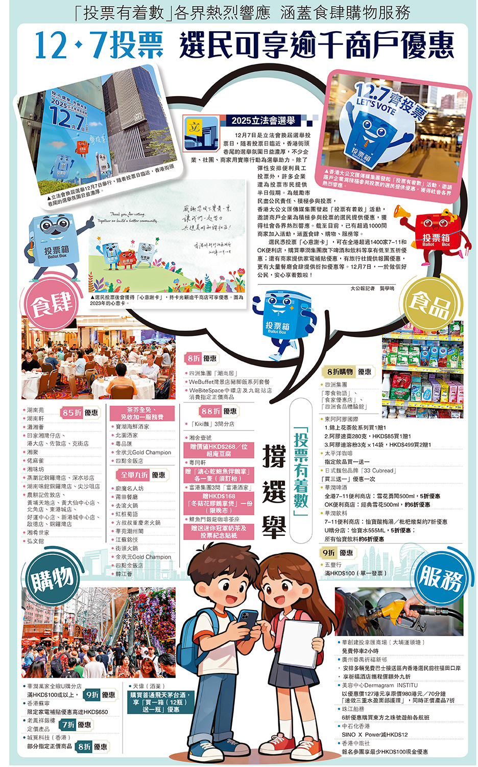 12月7日是立法會換屆選舉投票日,隨着投票日臨近,香港街頭巷尾的選舉氛圍日益濃厚,不少企業、社團、商家用實際行動為選舉助力。除了彈性安排便利員工投票外,許多企業還為投票市民提供半日假期。為鼓勵市民盡公民責任、積極參與投票,香港大公文匯傳媒集團發起「投票有着數」活動,邀請商戶企業為積極參與投票的選民提供優惠,獲得社會各界熱烈響應。截至目前,已有超過1000間商家加入活動,涵蓋食肆、購物、服務等。